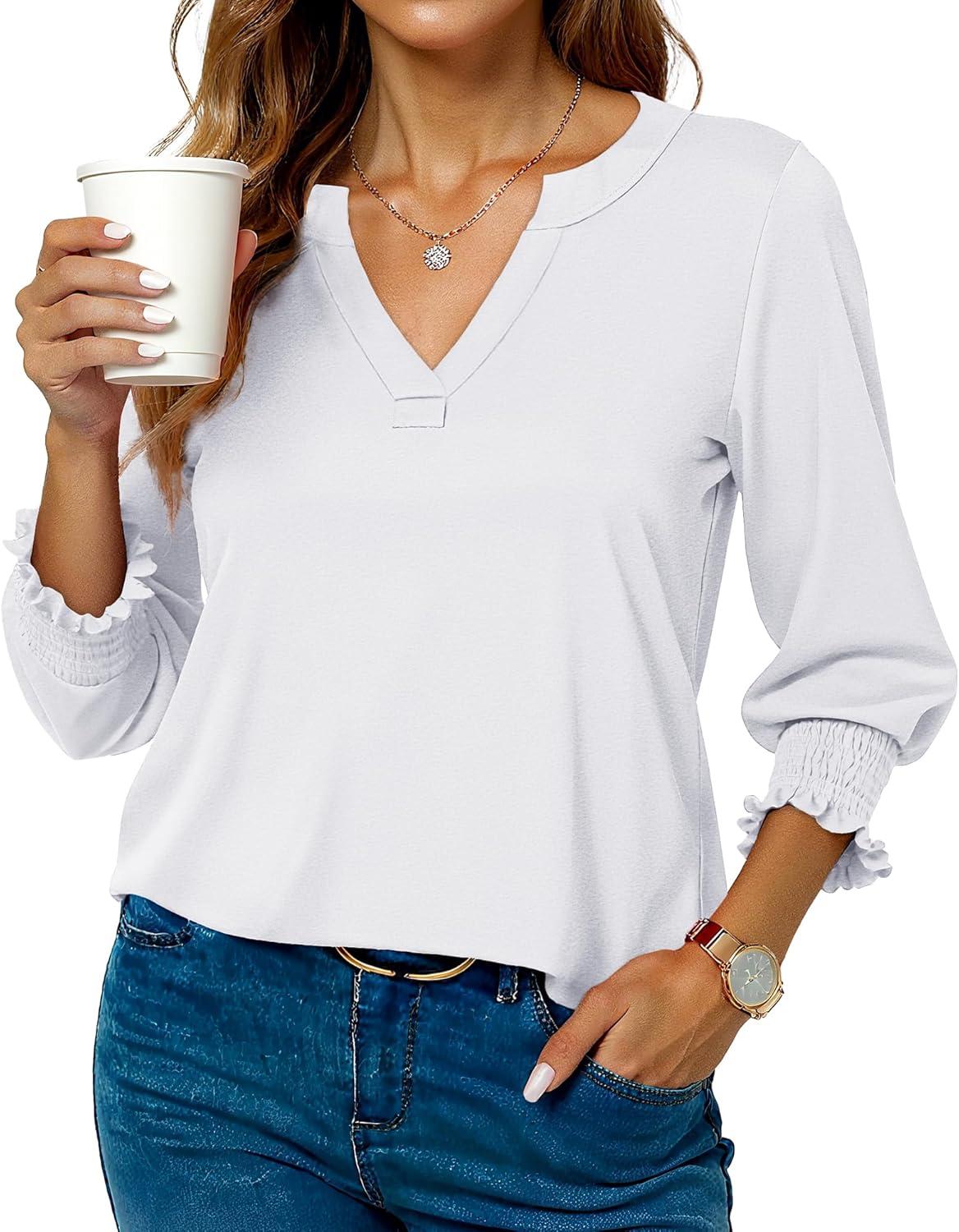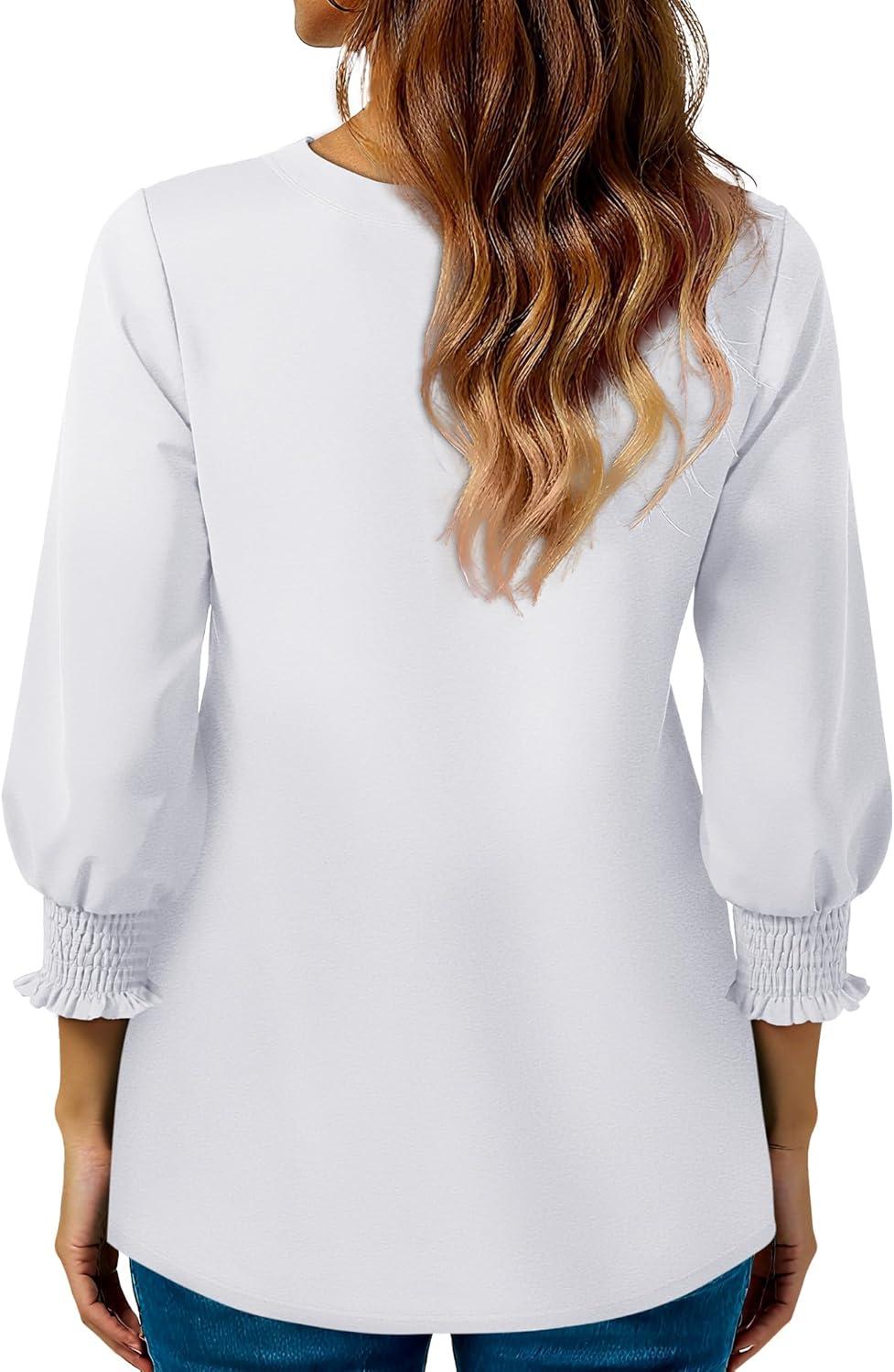 Blouses for Womens 3/4 Length Sleeve Casual Tops Loose V Neck T Shirt with Smocked Cuffs(White)