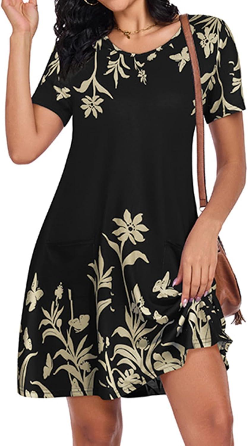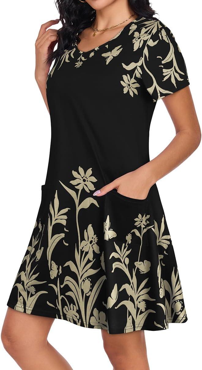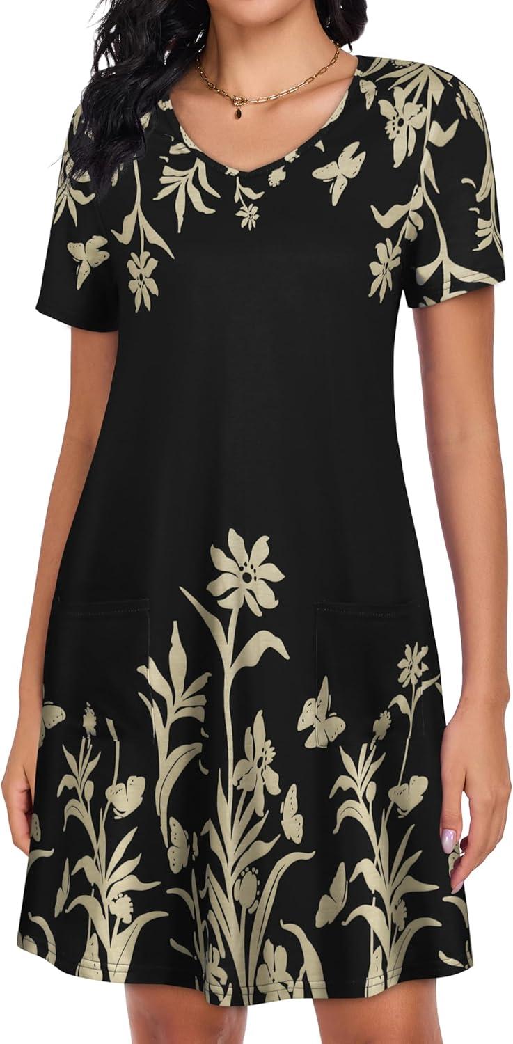 CHICGAL Summer Dresses for Women V Neck Short Sleeve Casual Loose T Shirt Sundress Beach Cover Ups with Pockets(Black Floral)