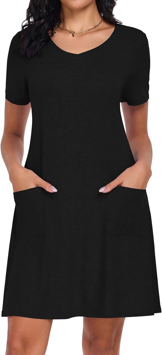 CHICGAL Summer Dresses for Women V Neck Short Sleeve Casual Loose T Shirt Sundress Beach Cover Ups with Pockets(Black)
