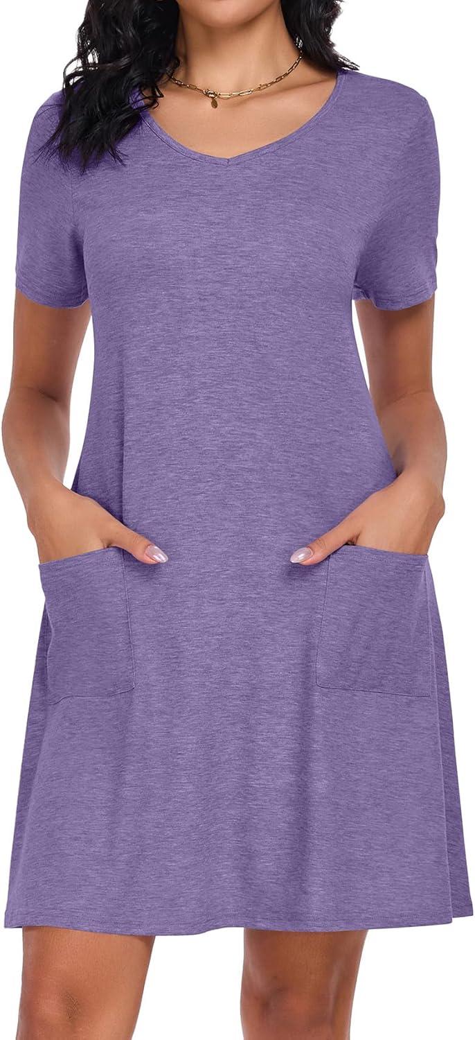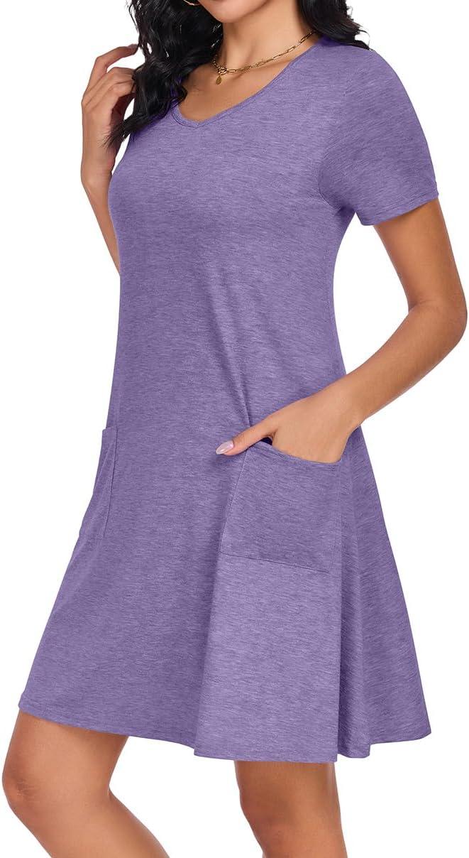 CHICGAL Summer Dresses for Women V Neck Short Sleeve Casual Loose T Shirt Sundress Beach Cover Ups with Pockets(Light Purple)