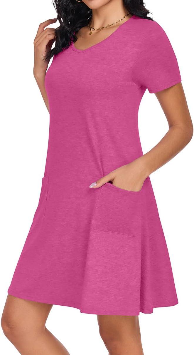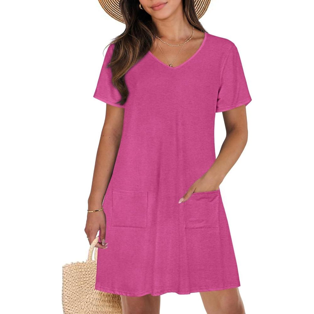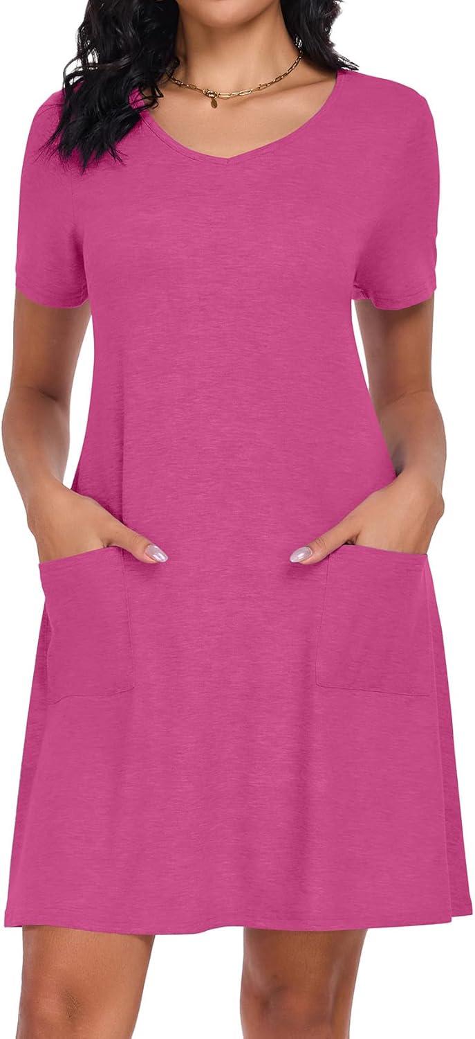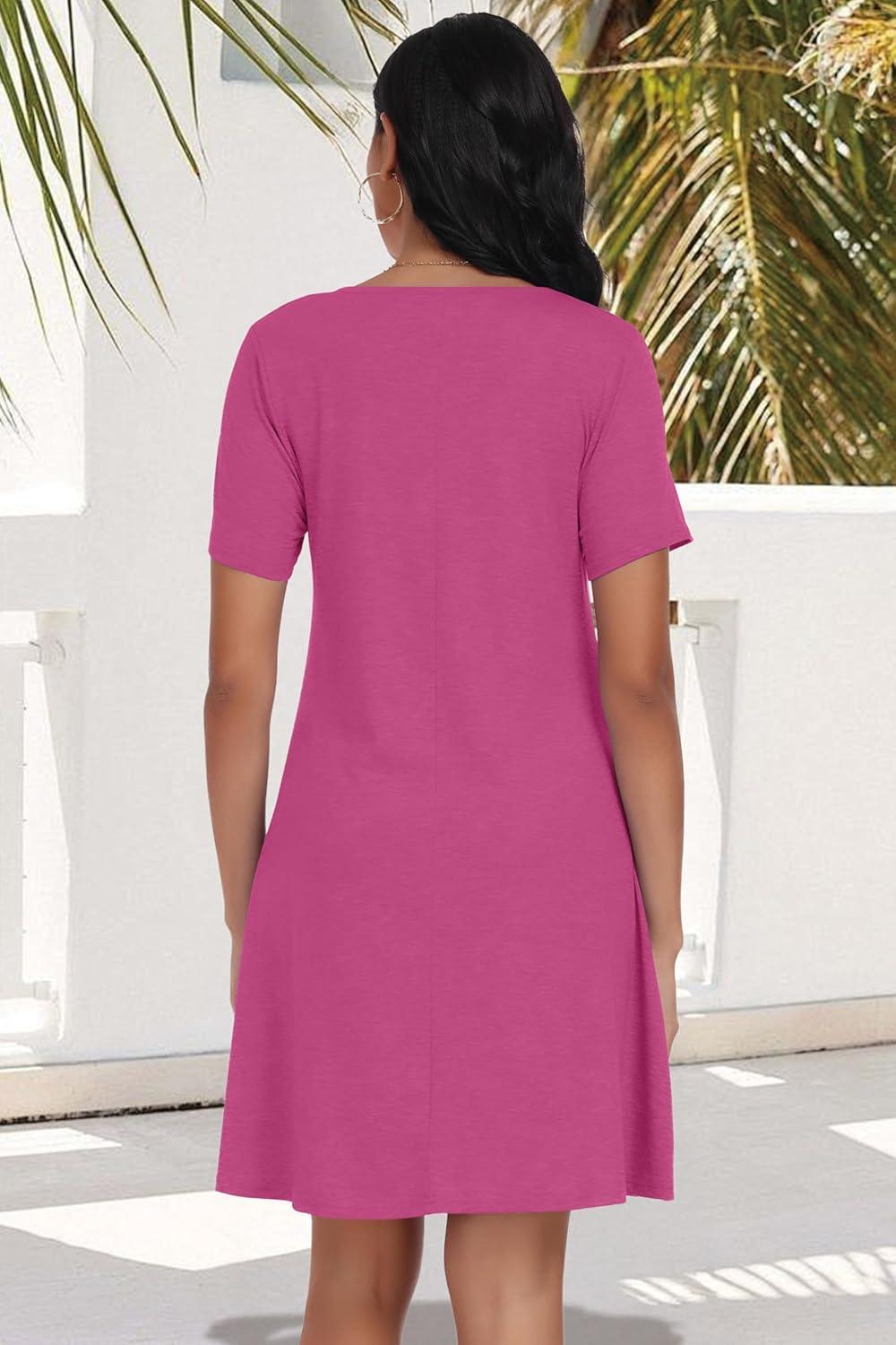 CHICGAL Summer Dresses for Women V Neck Short Sleeve Casual Loose T Shirt Sundress Beach Cover Ups with Pockets(Rose Red)