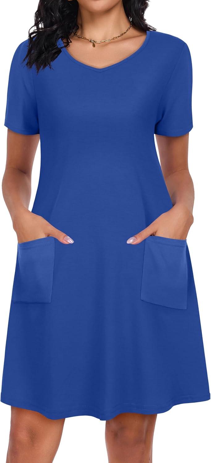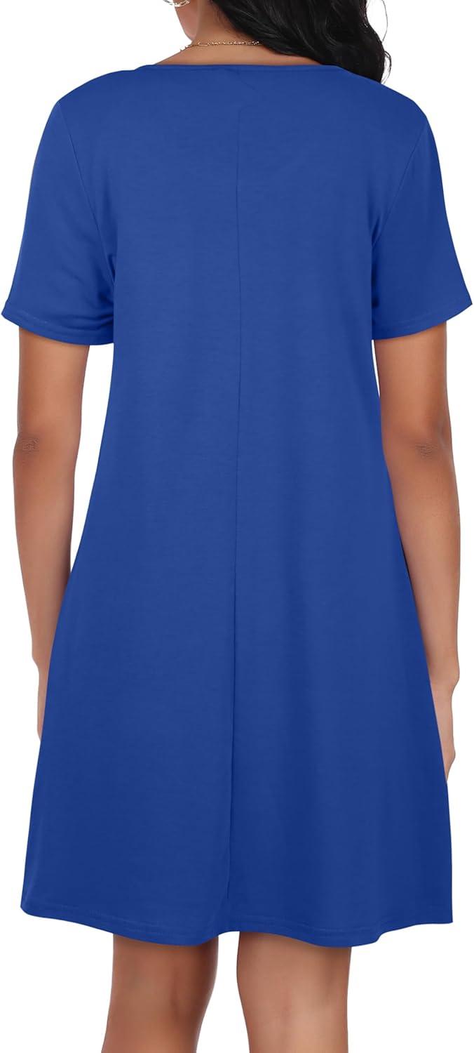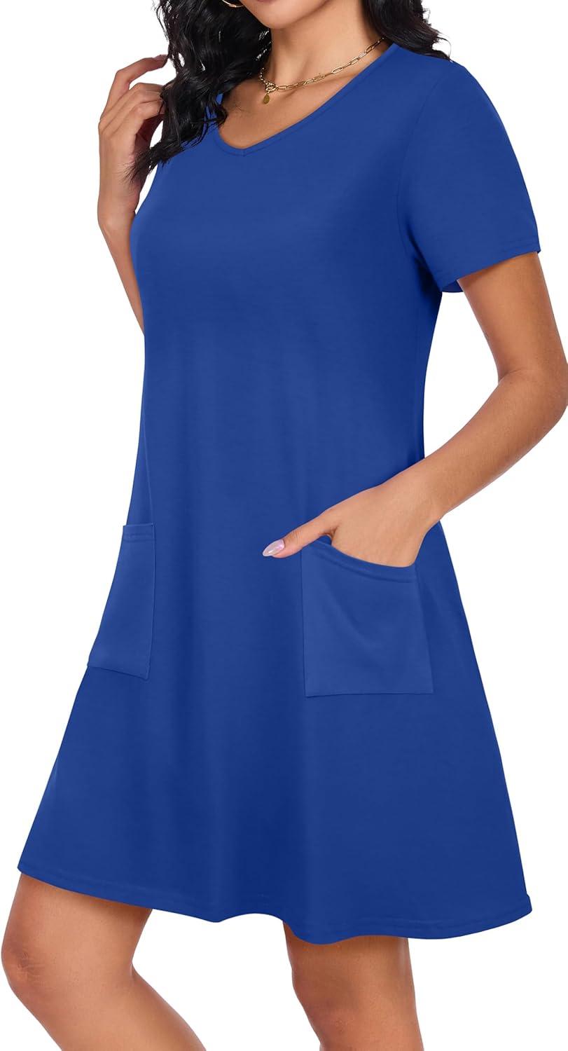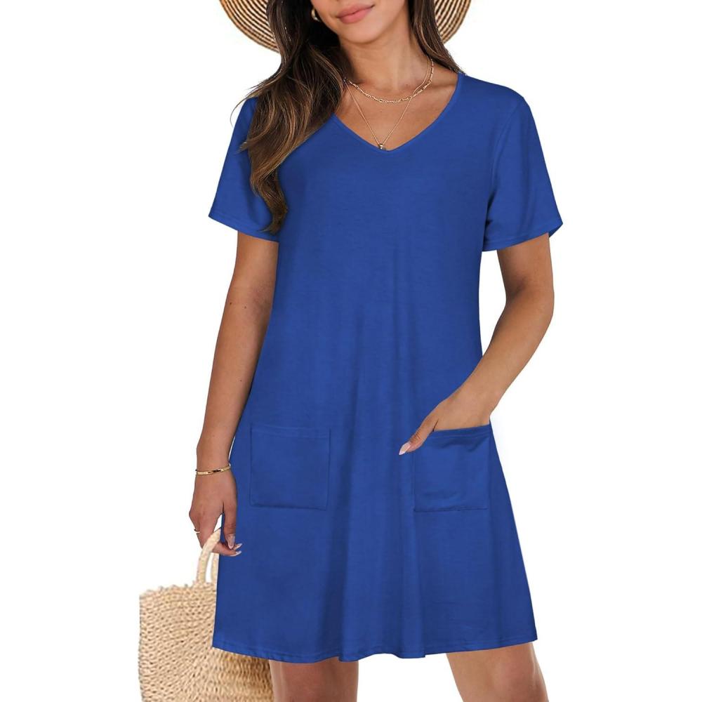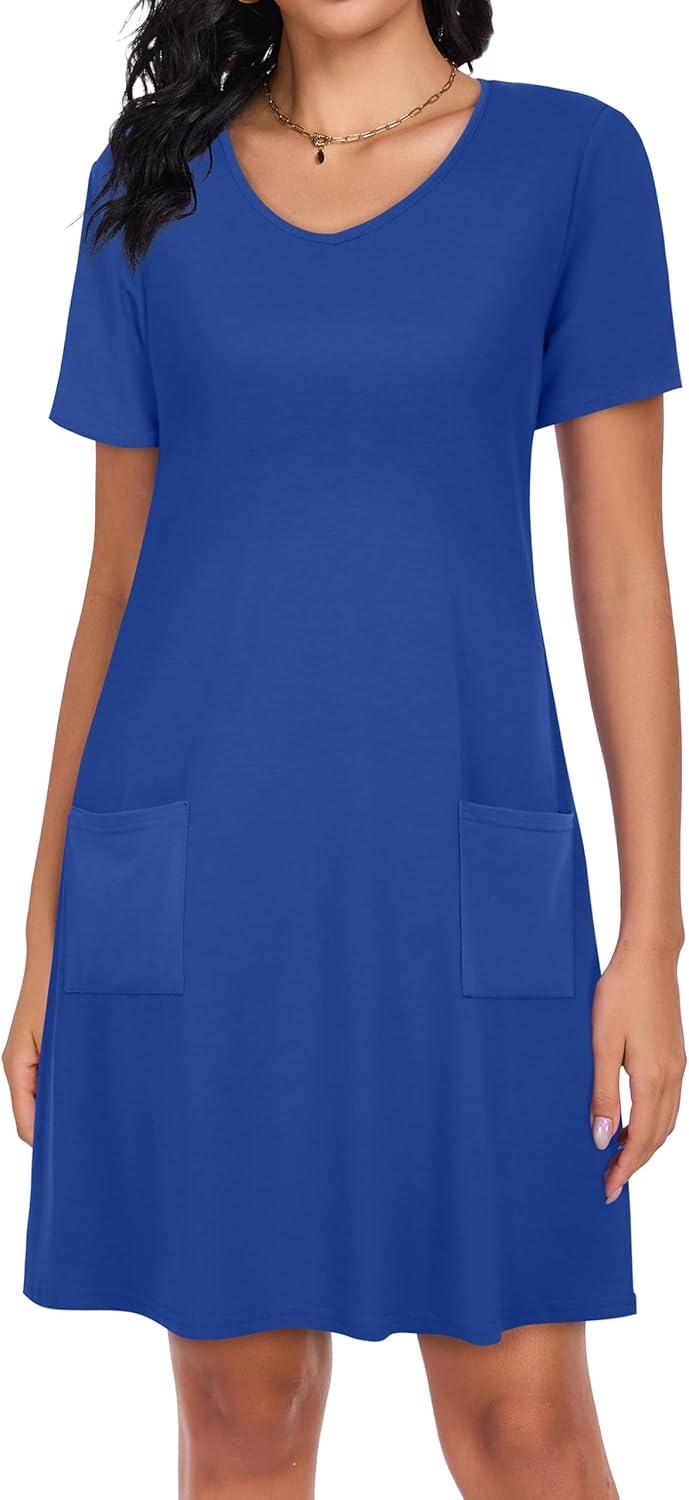 CHICGAL Summer Dresses for Women V Neck Short Sleeve Casual Loose T Shirt Sundress Beach Cover Ups with Pockets(Royal Blue)