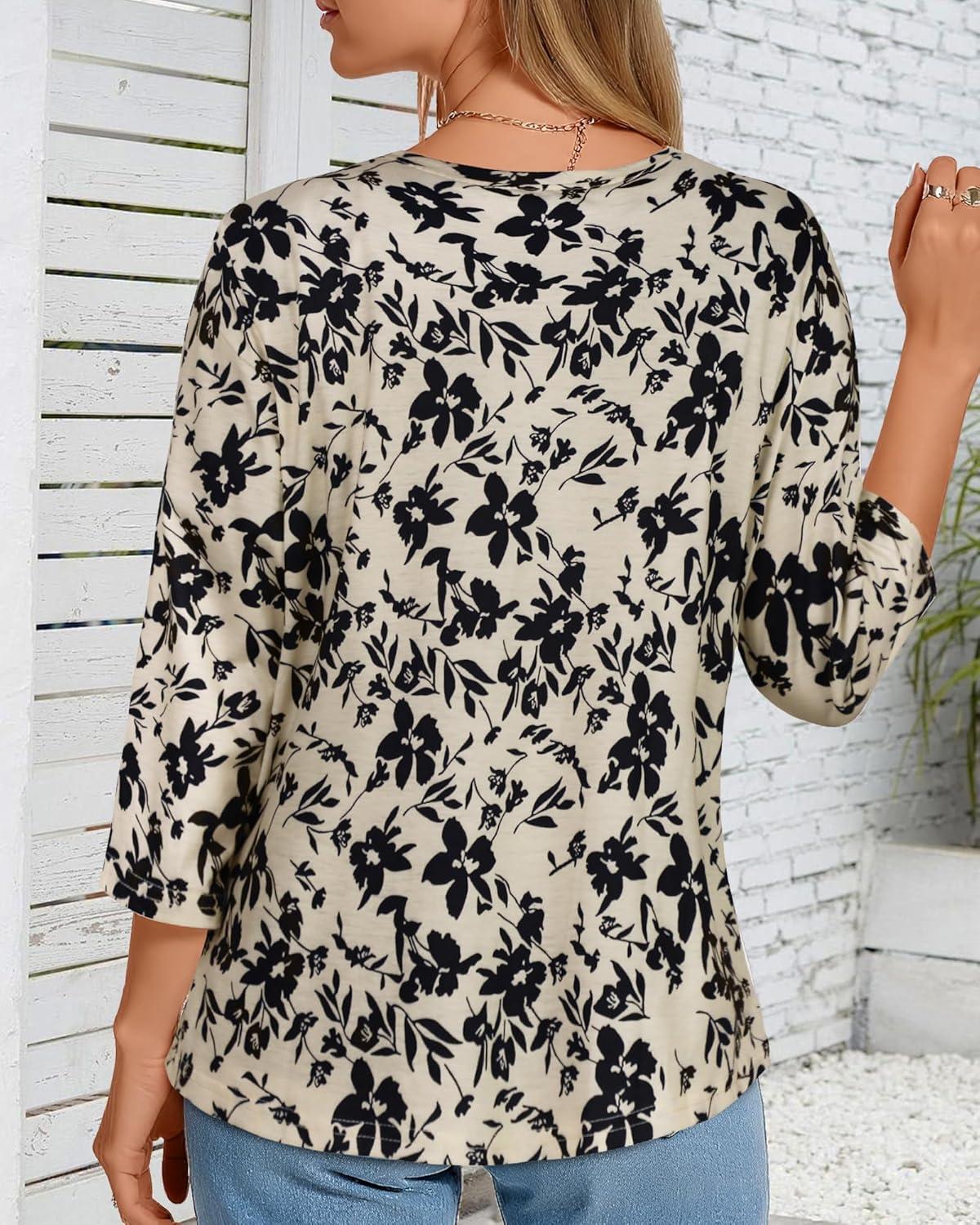 CHICGAL Women 3/4 Sleeve Shirts Casual Round Neck Tops Basic Tees Cute T-Shirts Blouses(Apricot Floral)