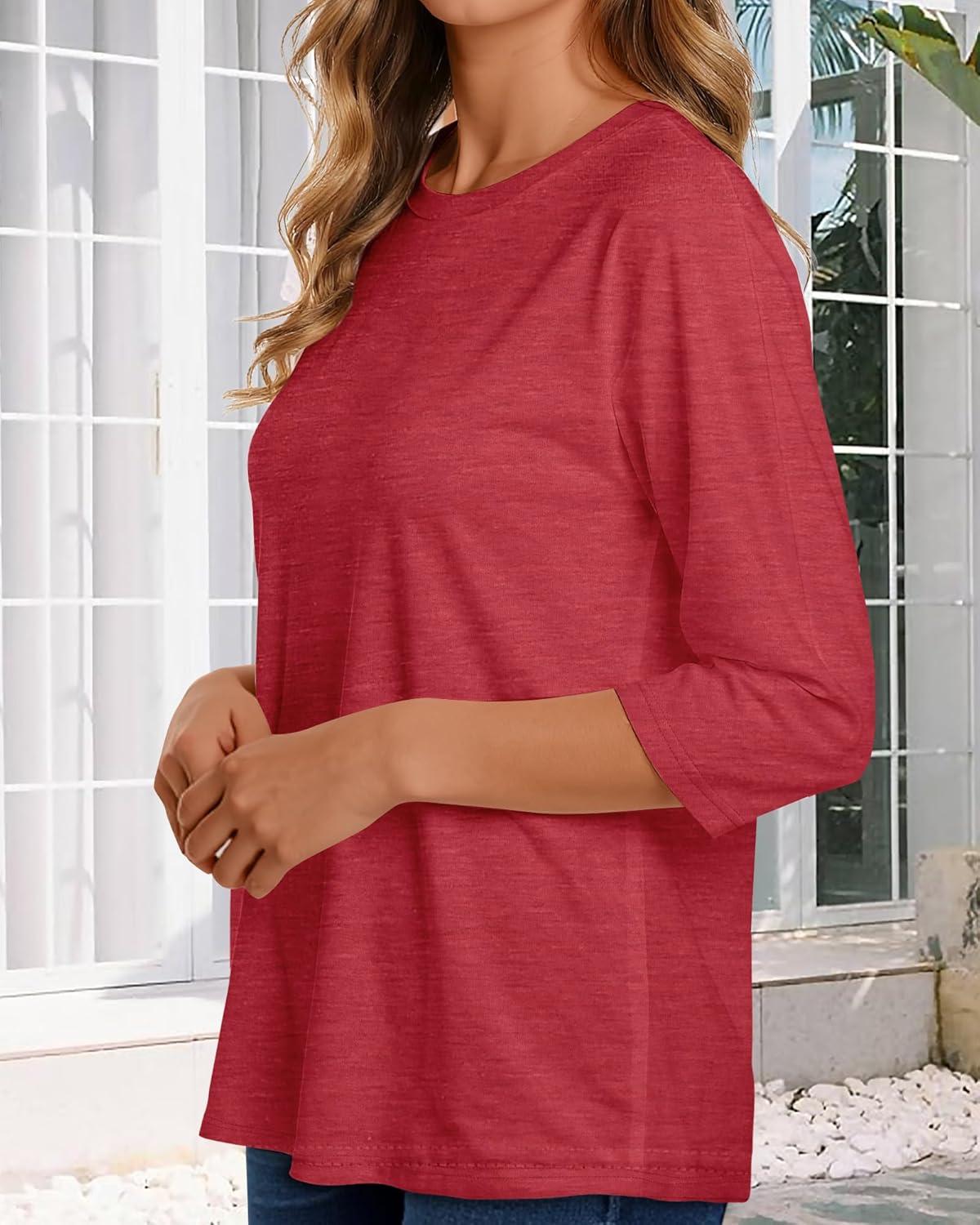 CHICGAL Women 3/4 Sleeve Shirts Casual Round Neck Tops Basic Tees Cute T-Shirts Blouses(B Red)