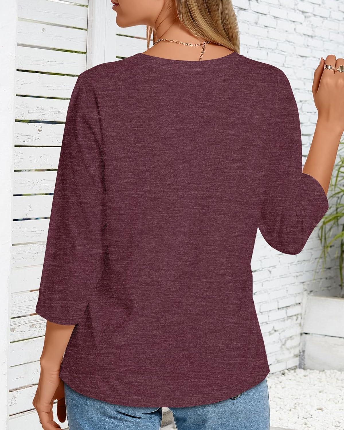 CHICGAL Women 3/4 Sleeve Shirts Casual Round Neck Tops Basic Tees Cute T-Shirts Blouses(Deep Red)