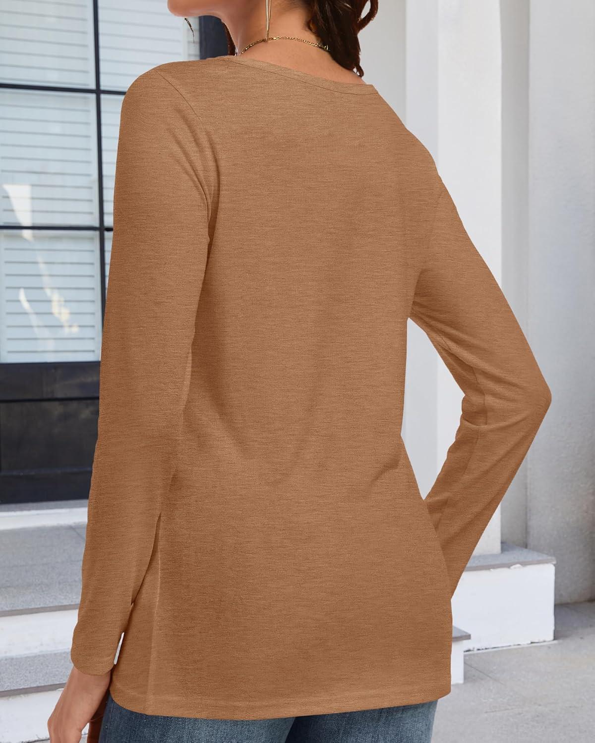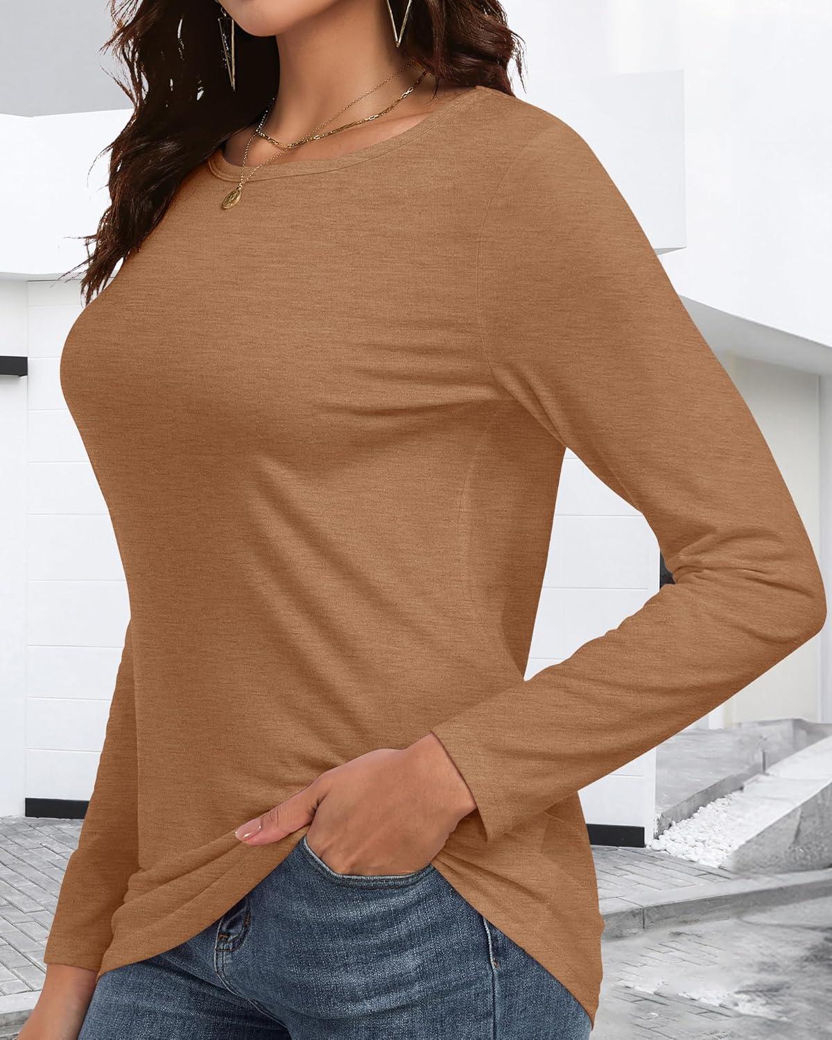 CHICGAL Women Long Sleeve Shirts Casual Fall Tees Crew Neck Basic Tunic Tops(Coffee)
