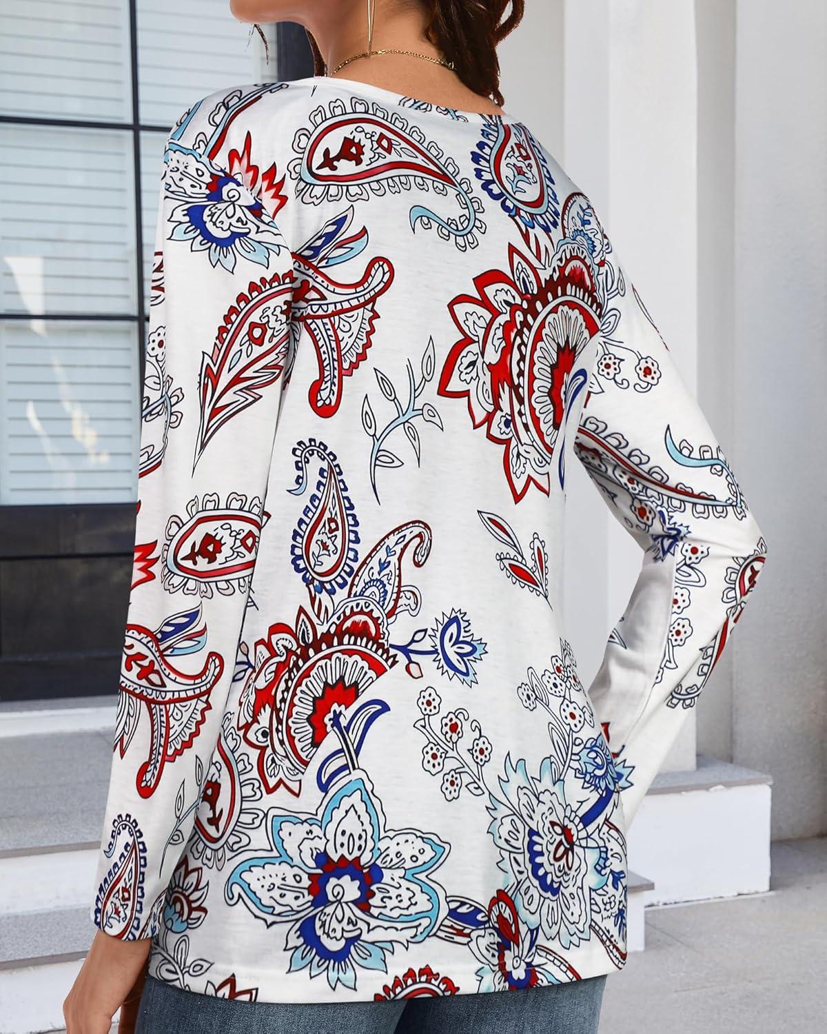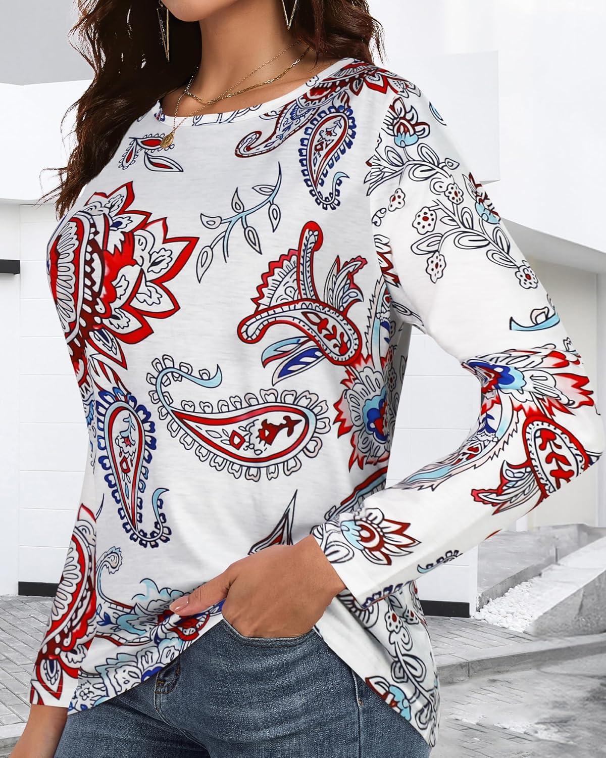 CHICGAL Women Long Sleeve Shirts Casual Fall Tees Crew Neck Basic Tunic Tops(White Paisley)
