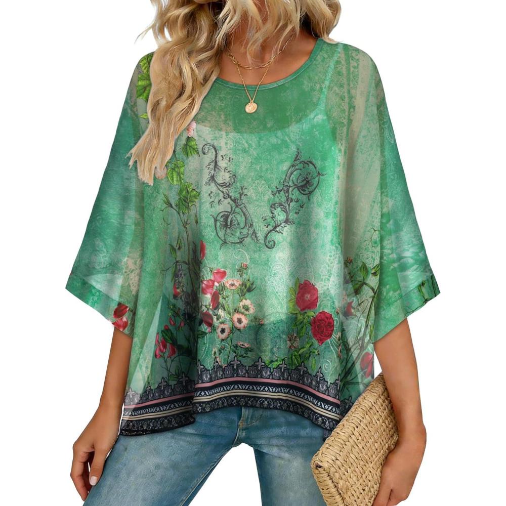 CHICGAL Womens Beach Cover ups Chiffon Poncho Tops Batwing Sleeve Casual Loose Fit Summer Blouses(Green Flowers)