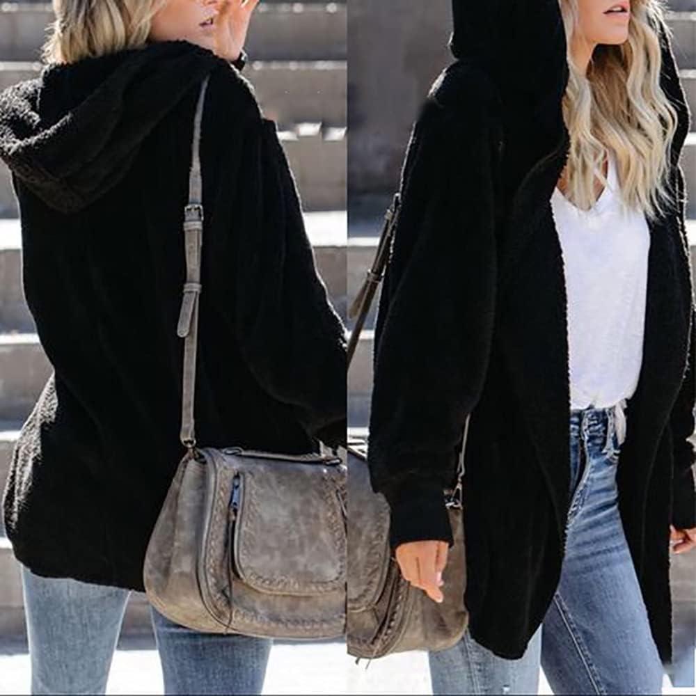 CHICGAL Womens Fuzzy Jacket Hooded Cardigan Open Front Sherpa Coat Outwear with Pockets(Black)