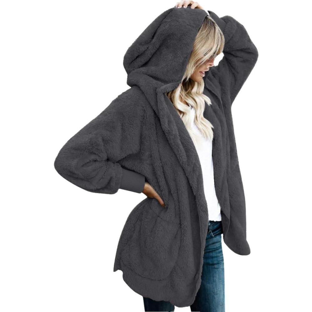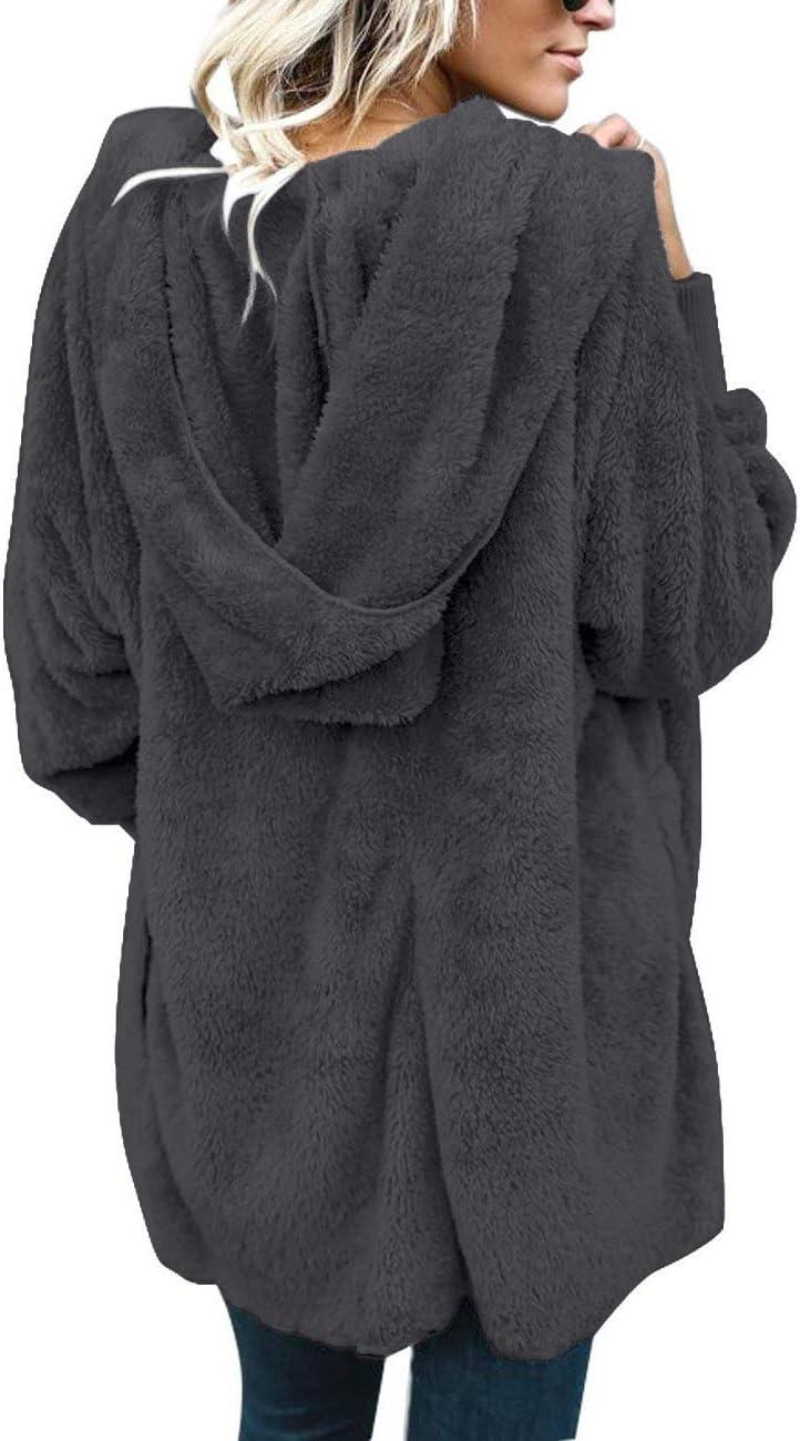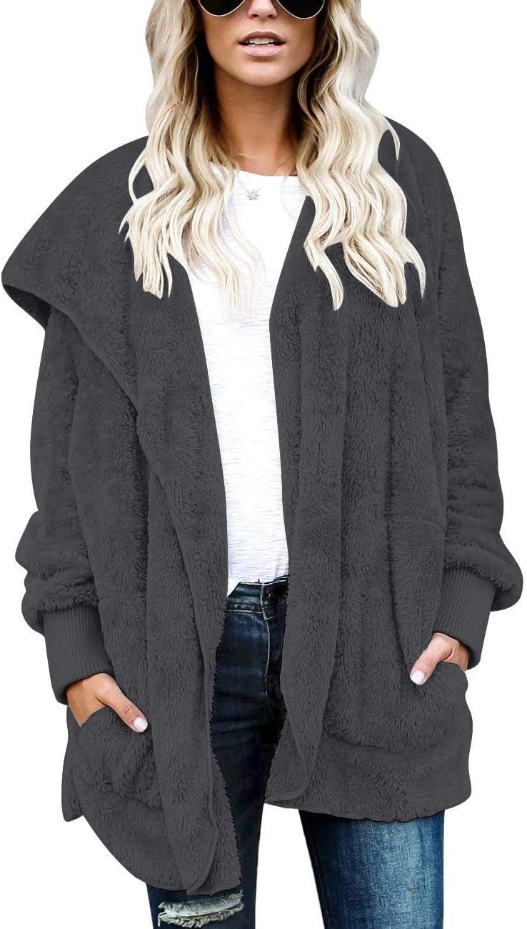 CHICGAL Womens Fuzzy Jacket Hooded Cardigan Open Front Sherpa Coat Outwear with Pockets(Dark Grey)