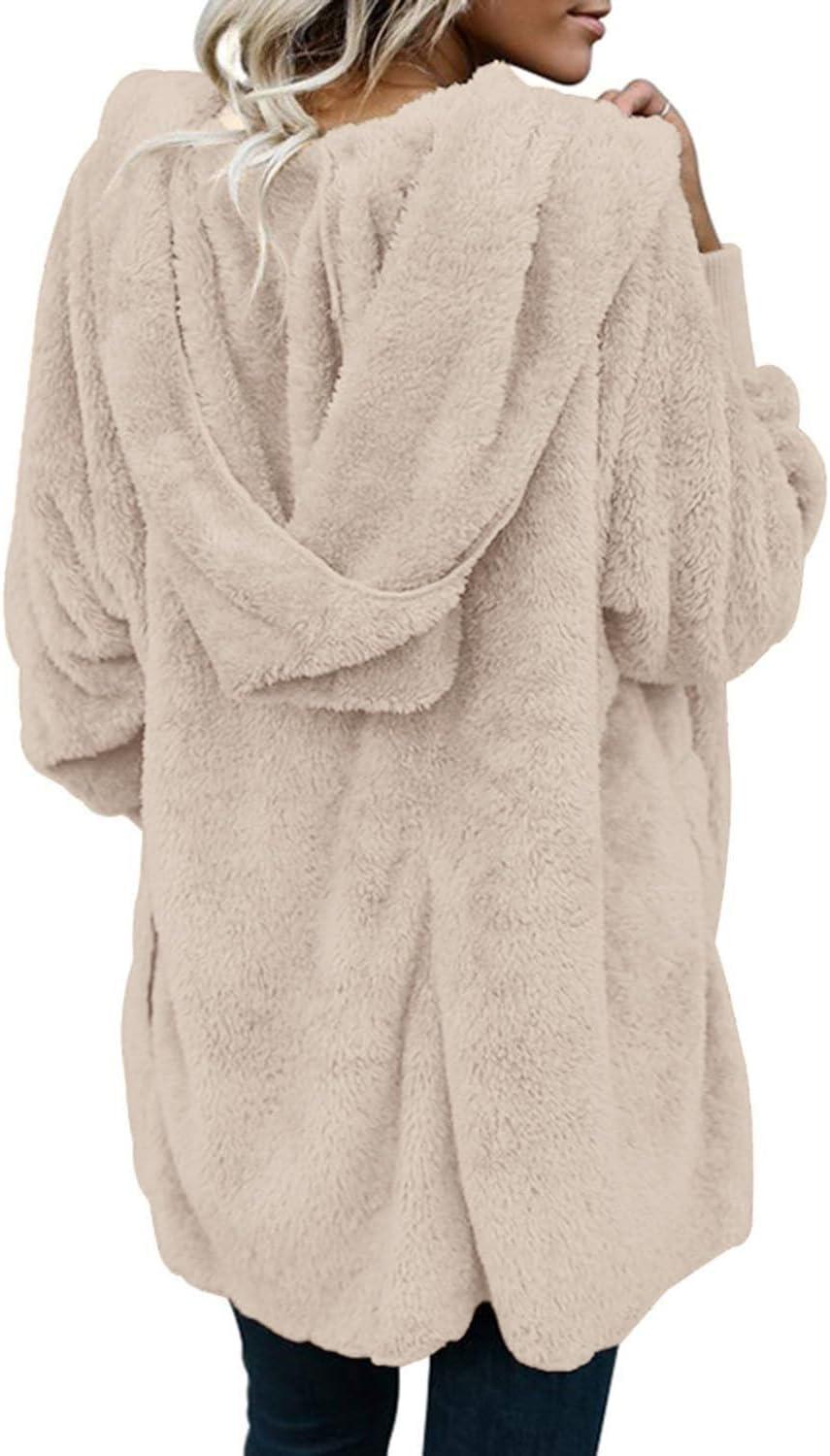 CHICGAL Womens Fuzzy Jacket Hooded Cardigan Open Front Sherpa Coat Outwear with Pockets(Light Khaki)
