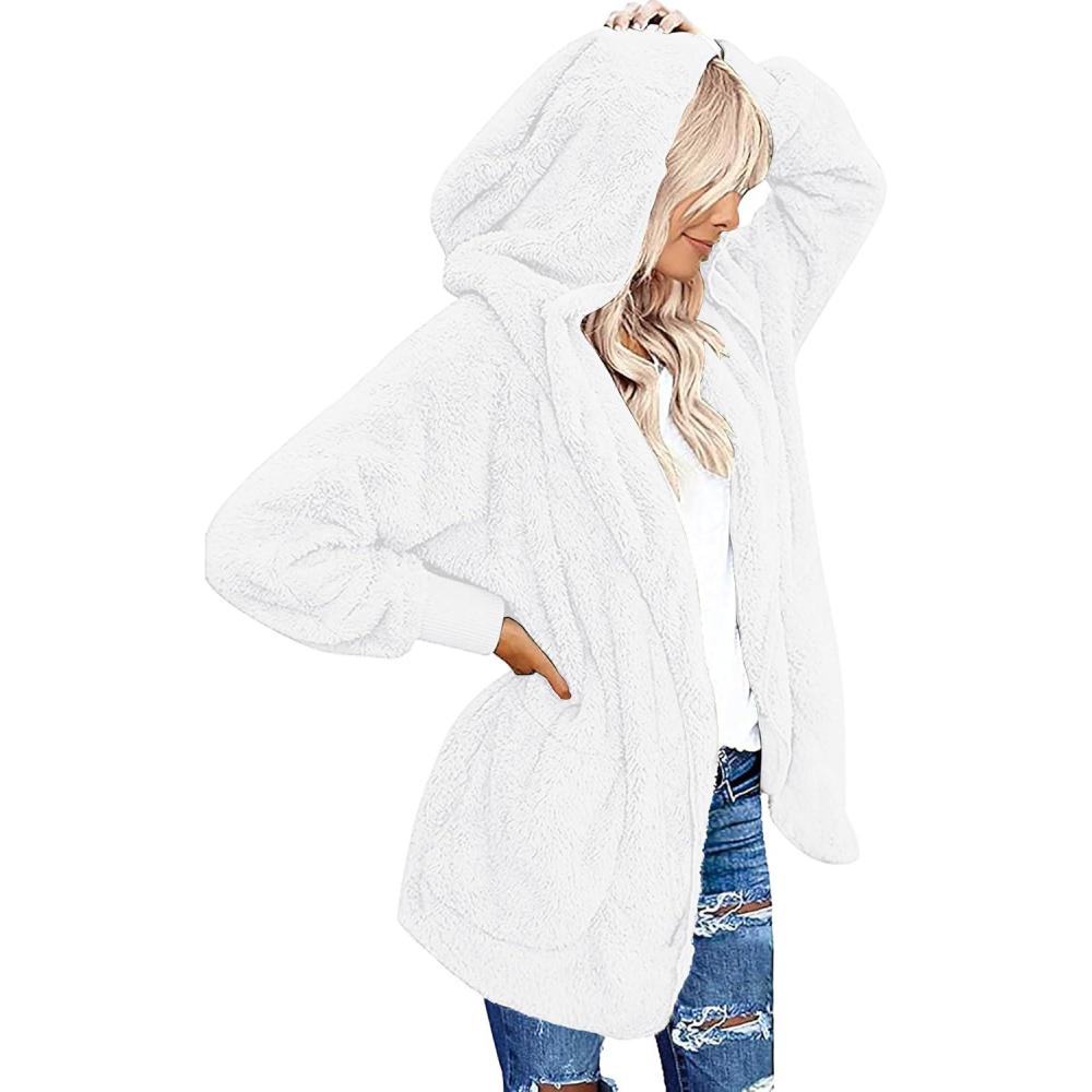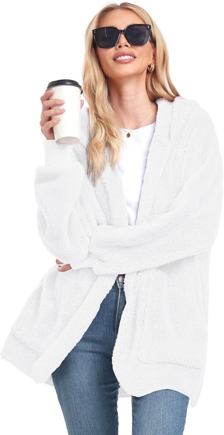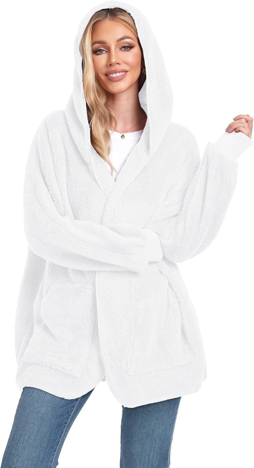 CHICGAL Womens Fuzzy Jacket Hooded Cardigan Open Front Sherpa Coat Outwear with Pockets(White)