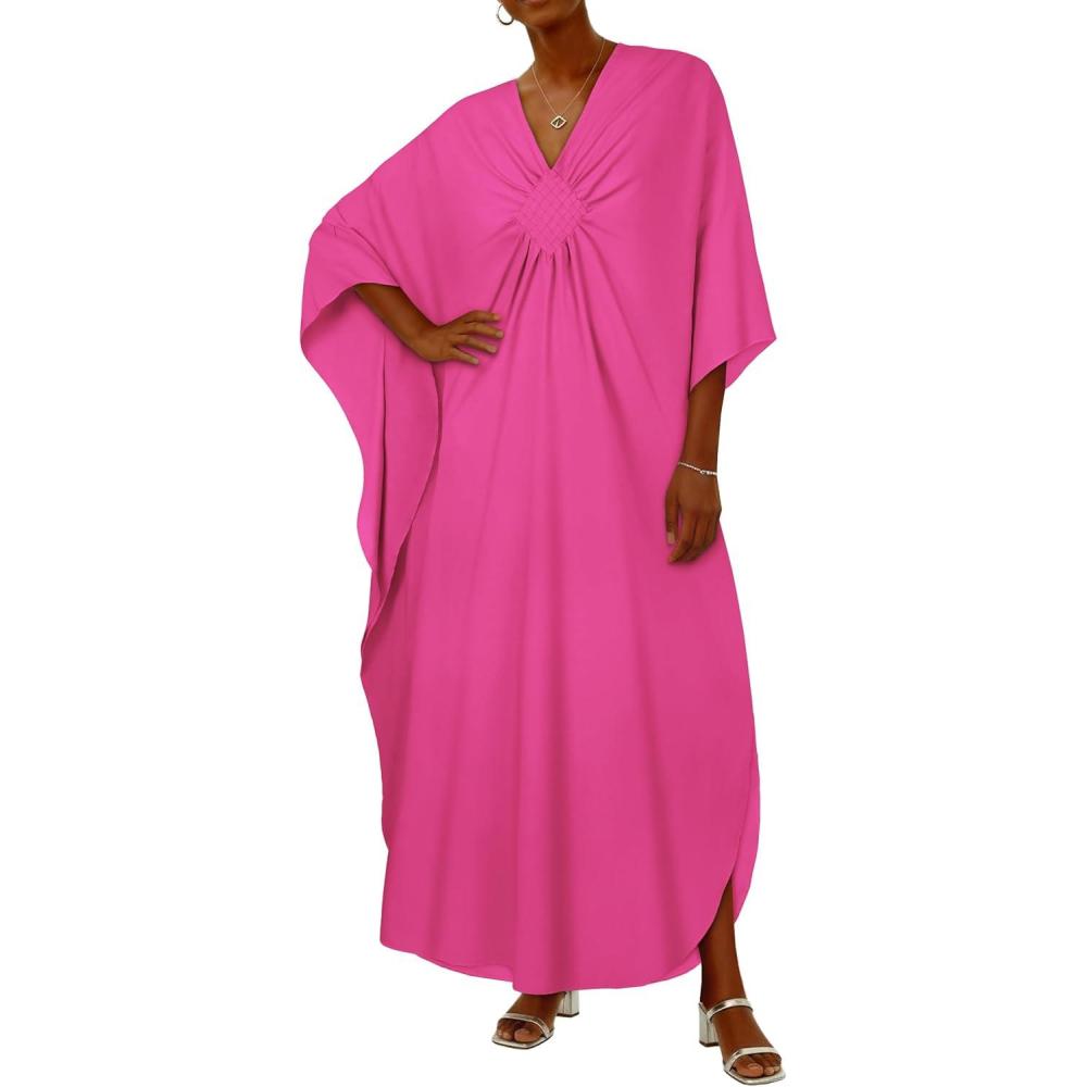 CHICGAL Womens Kaftan Dresses Long Caftans Plus Size Batwing Sleeve Swimsuit Coverup V Neck Summer Beach Dress(Rose Pink)
