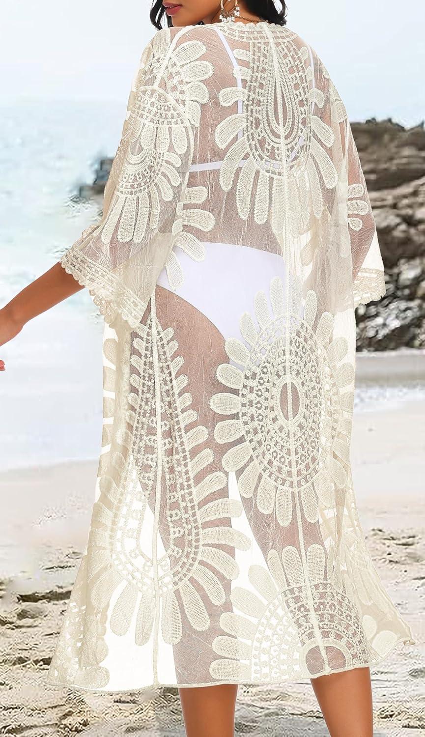 CHICGAL Womens Swimsuit Coverup Lace Bathing Suit Cover Up Beach Kimonos Long Cardigan Open Front Swimwear(Apricot)