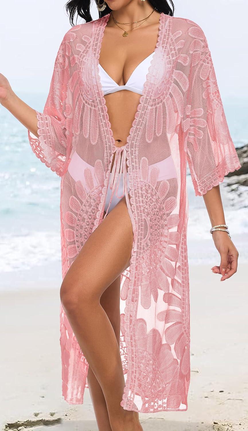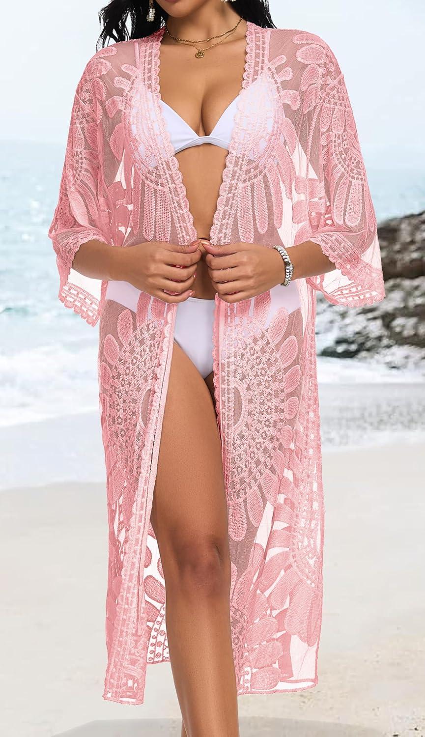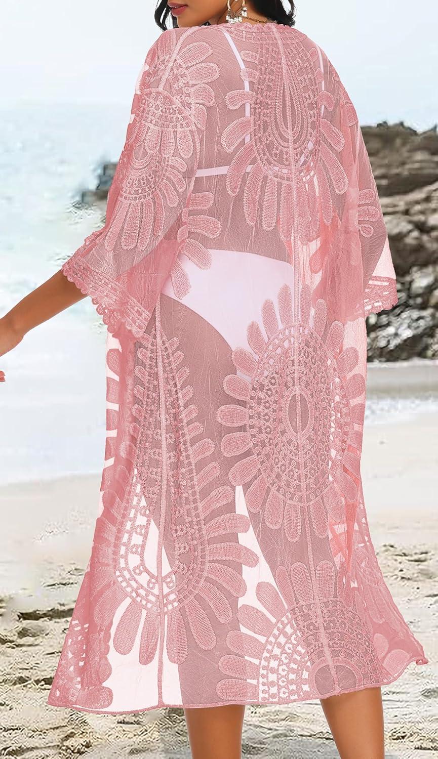 CHICGAL Womens Swimsuit Coverup Lace Bathing Suit Cover Up Beach Kimonos Long Cardigan Open Front Swimwear(Pink)