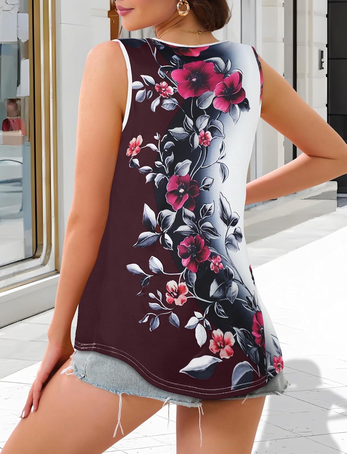CHICGAL Womens Tank Tops Summer Sleeveless Blouse Crewneck Casual Loose Fit Tunic Shirt(Black Red Floral)