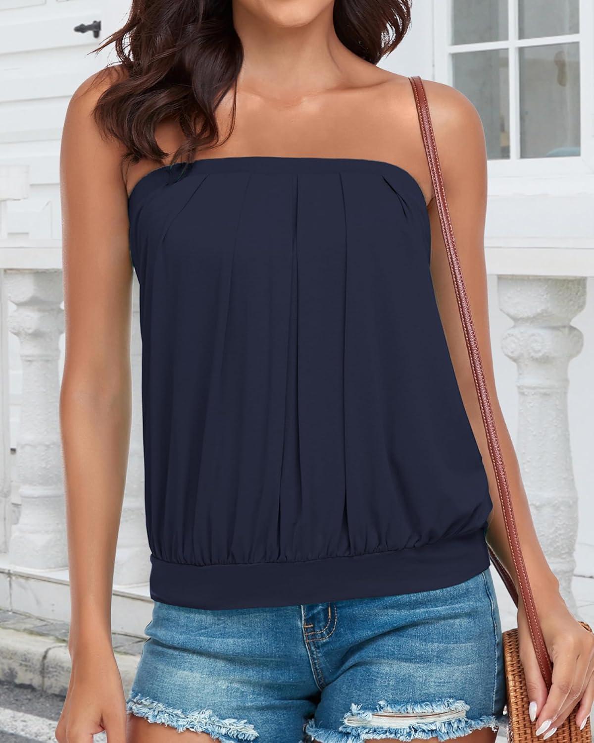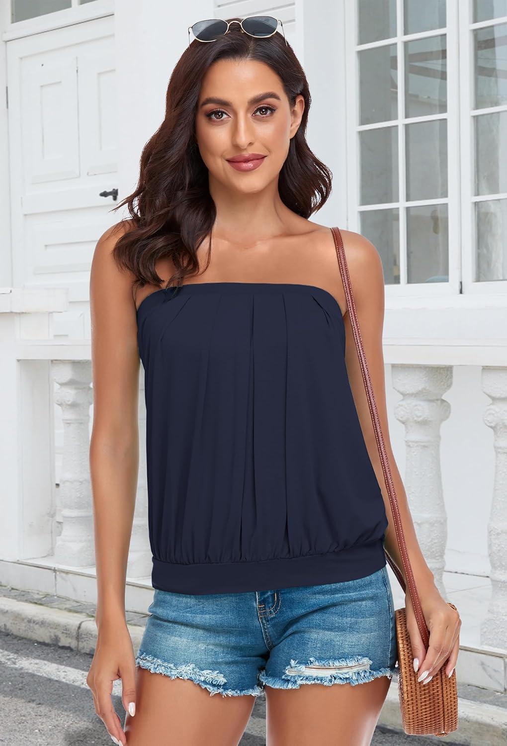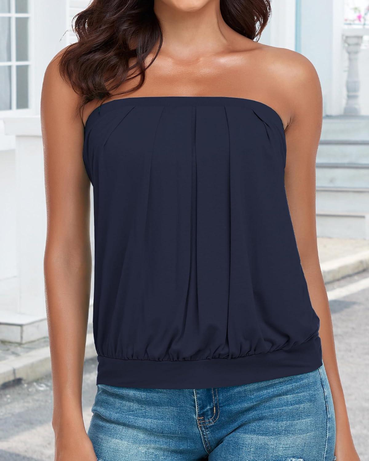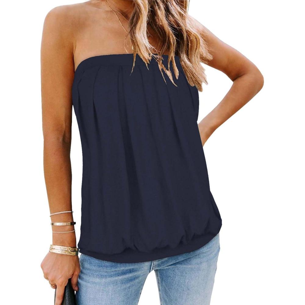 CHICGAL Women's Tube Tops Summer Casual Bandeau Tank Casual Strapless Blouse Off The Shoulder Tunic Shirts(B Solid Navy)