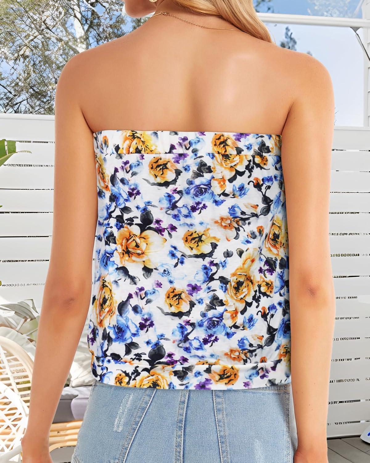 CHICGAL Women's Tube Tops Summer Casual Bandeau Tank Casual Strapless Blouse Off The Shoulder Tunic Shirts(Blue Orange Flower)