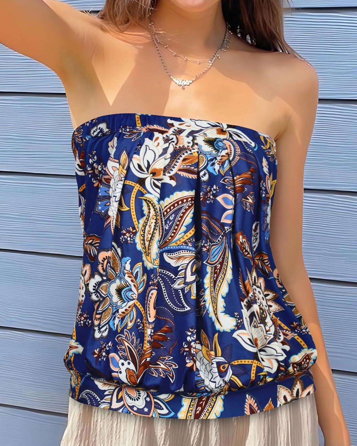 CHICGAL Women's Tube Tops Summer Casual Bandeau Tank Casual Strapless Blouse Off The Shoulder Tunic Shirts(Treasure Blue Print)