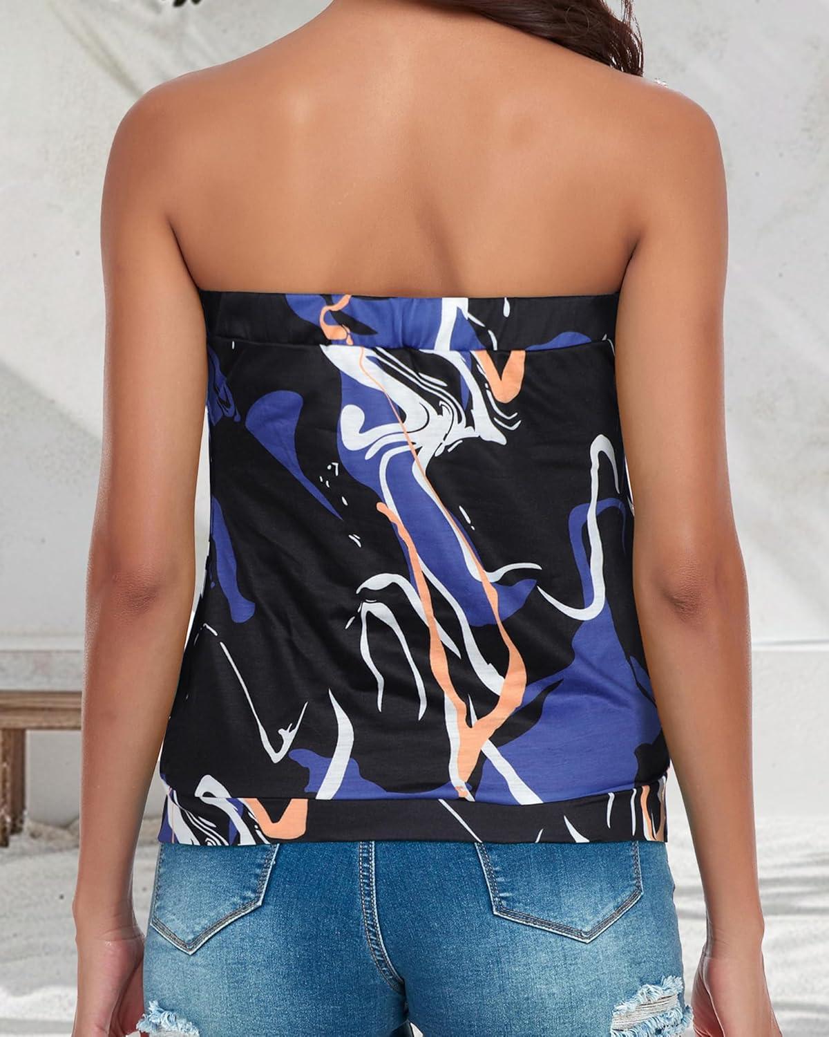 CHICGAL Women's Tube Tops Summer Casual Bandeau Tank Casual Strapless Blouse Off The Shoulder Tunic Shirts(White Blue Doodles)