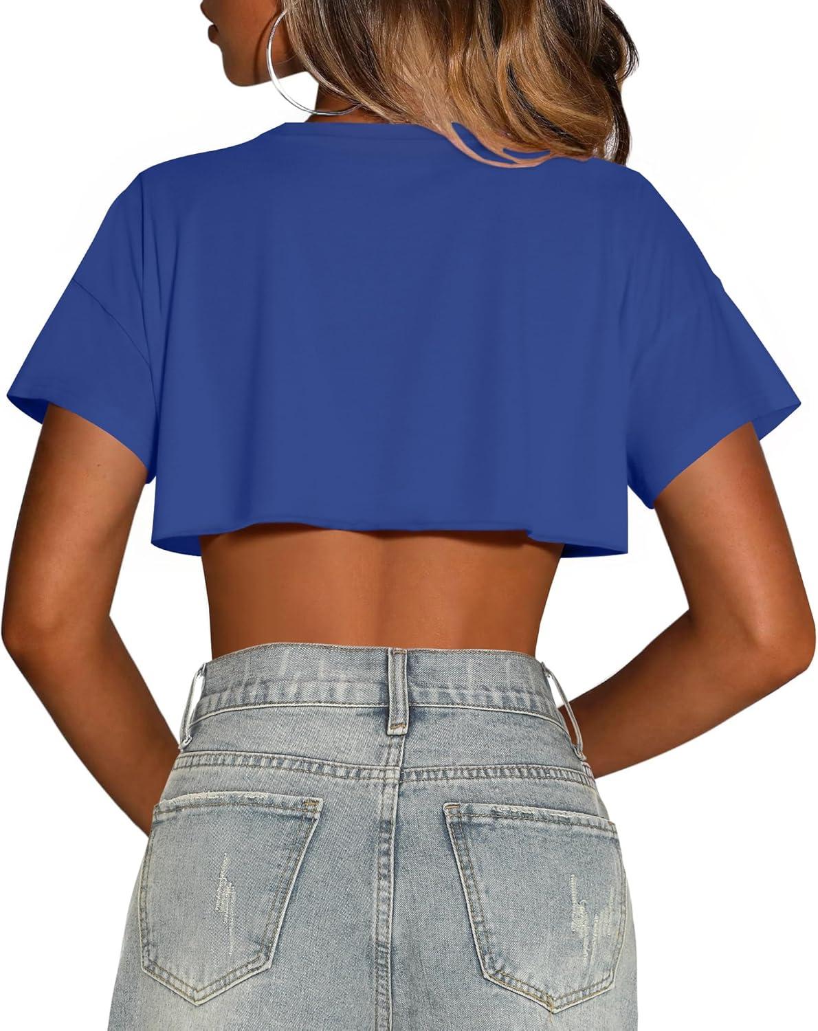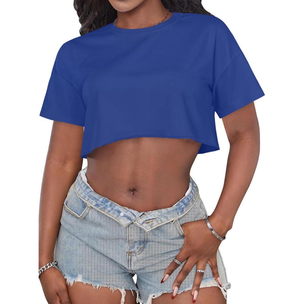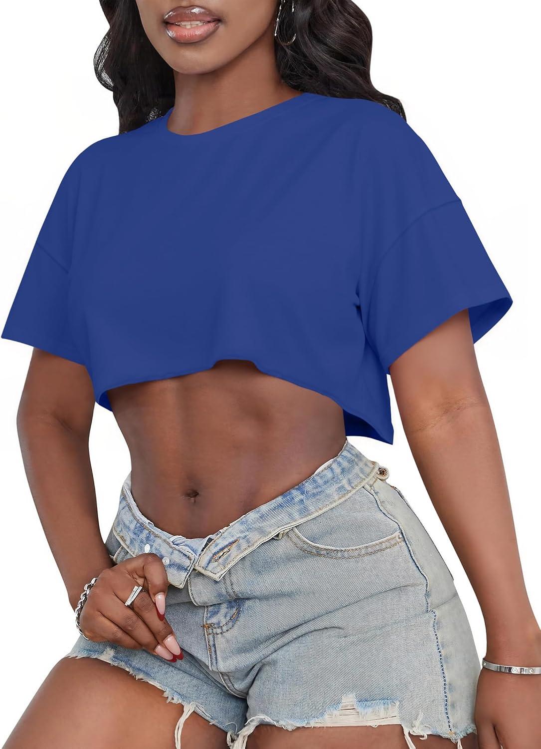 Crop Tops for Women Casual Short Sleeve T Shirts Summer Basic Top Crew Neck Oversized Cropped Tees(Blue)