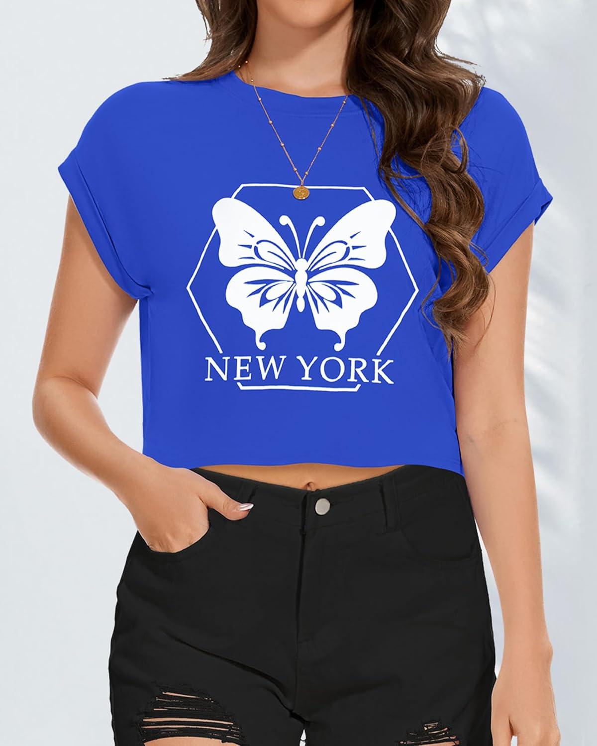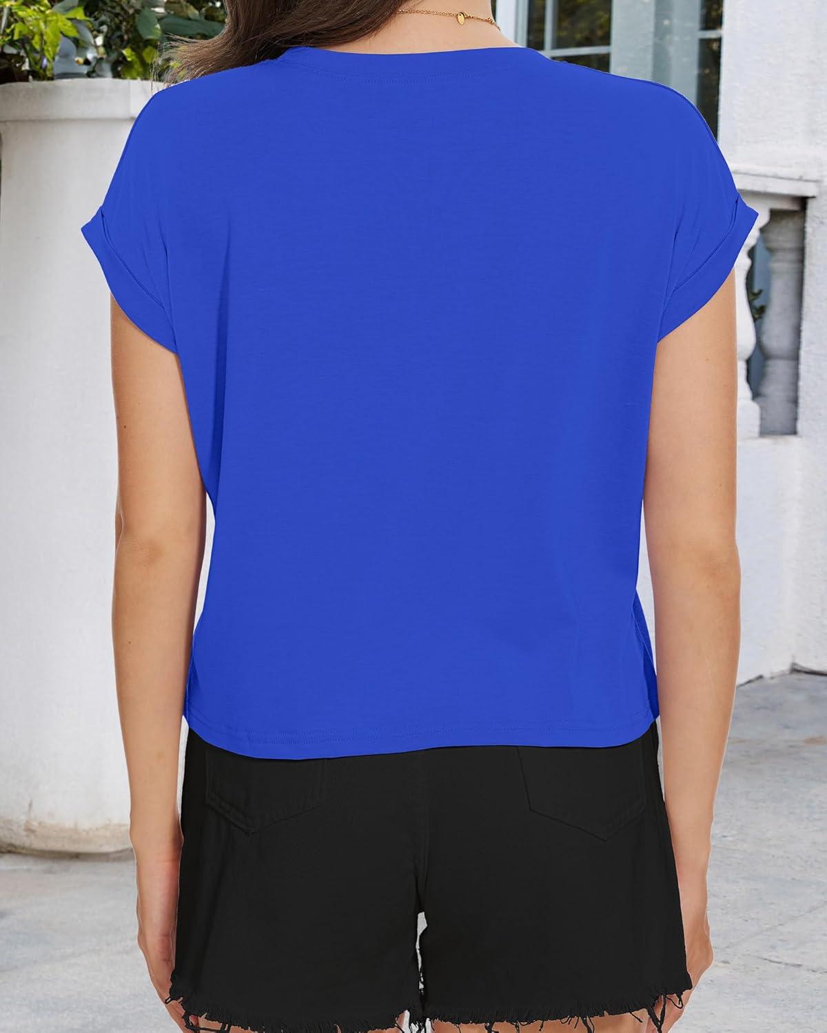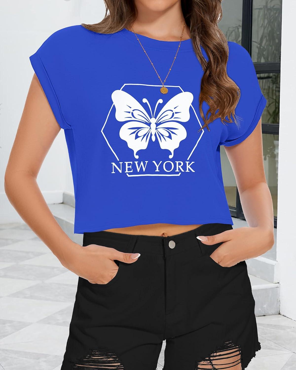 Summer Short Sleeve Crop Tops Womens Crewneck Roll Cap Sleeve T Shirts Loose Fit Basic Tees(C-dark Blue Butterfly)