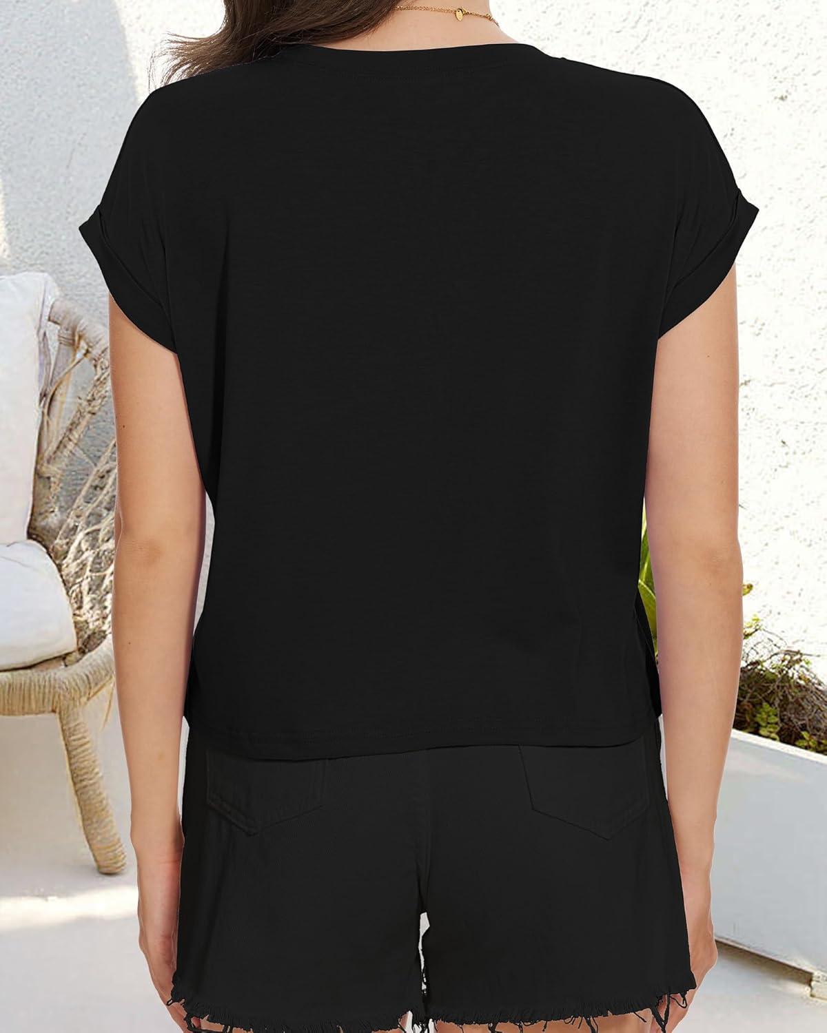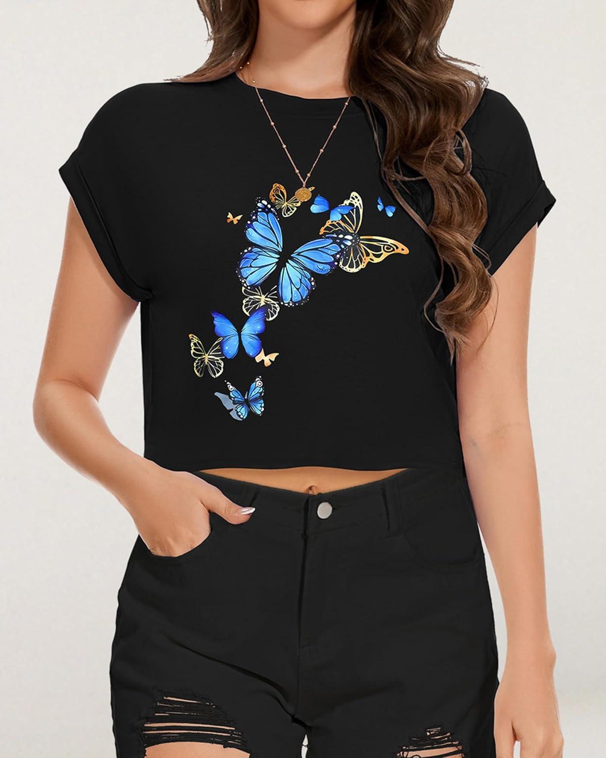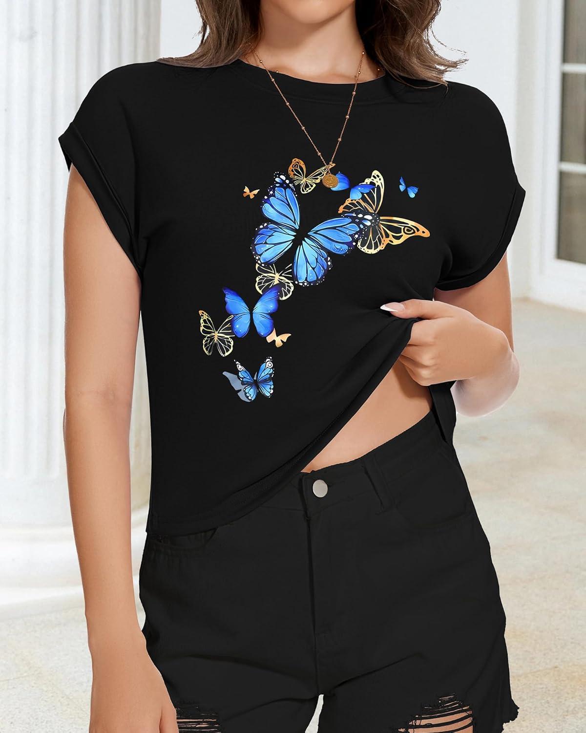Get more for your money with our exclusive bundle deals on Summer Short Sleeve Crop Tops Womens Crewneck Roll Cap Sleeve T Shirts Loose Fit Basic Tees(D Black Butterfly) and accessories.