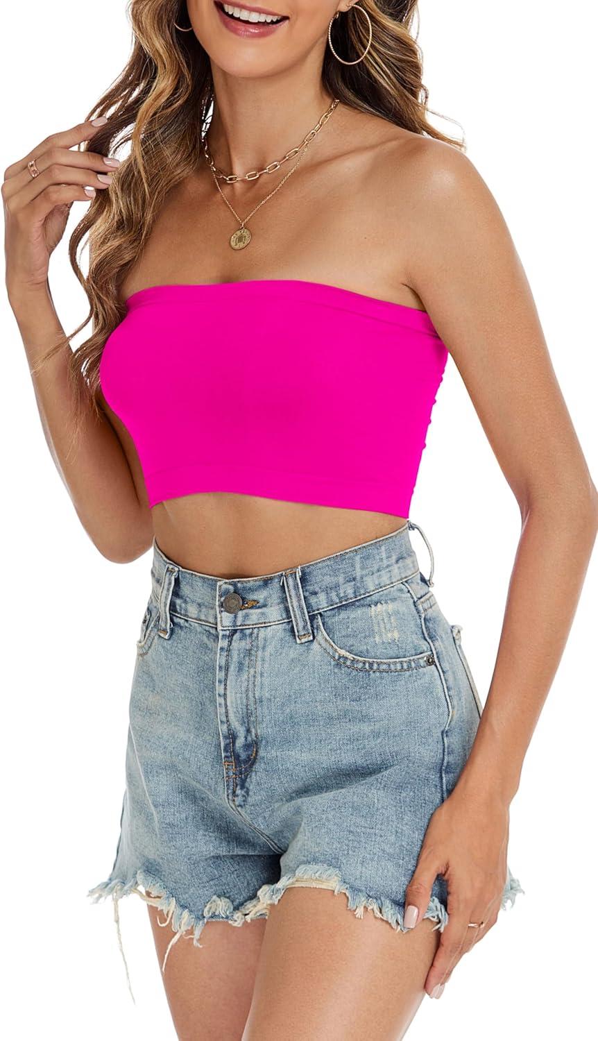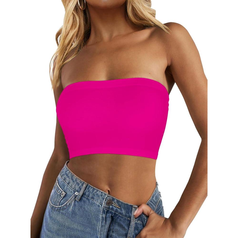 Tube Tops for Women Summer Crop Top Basic Casual Bandeau Going Out Strapless Short Shirt(Neon Pink)