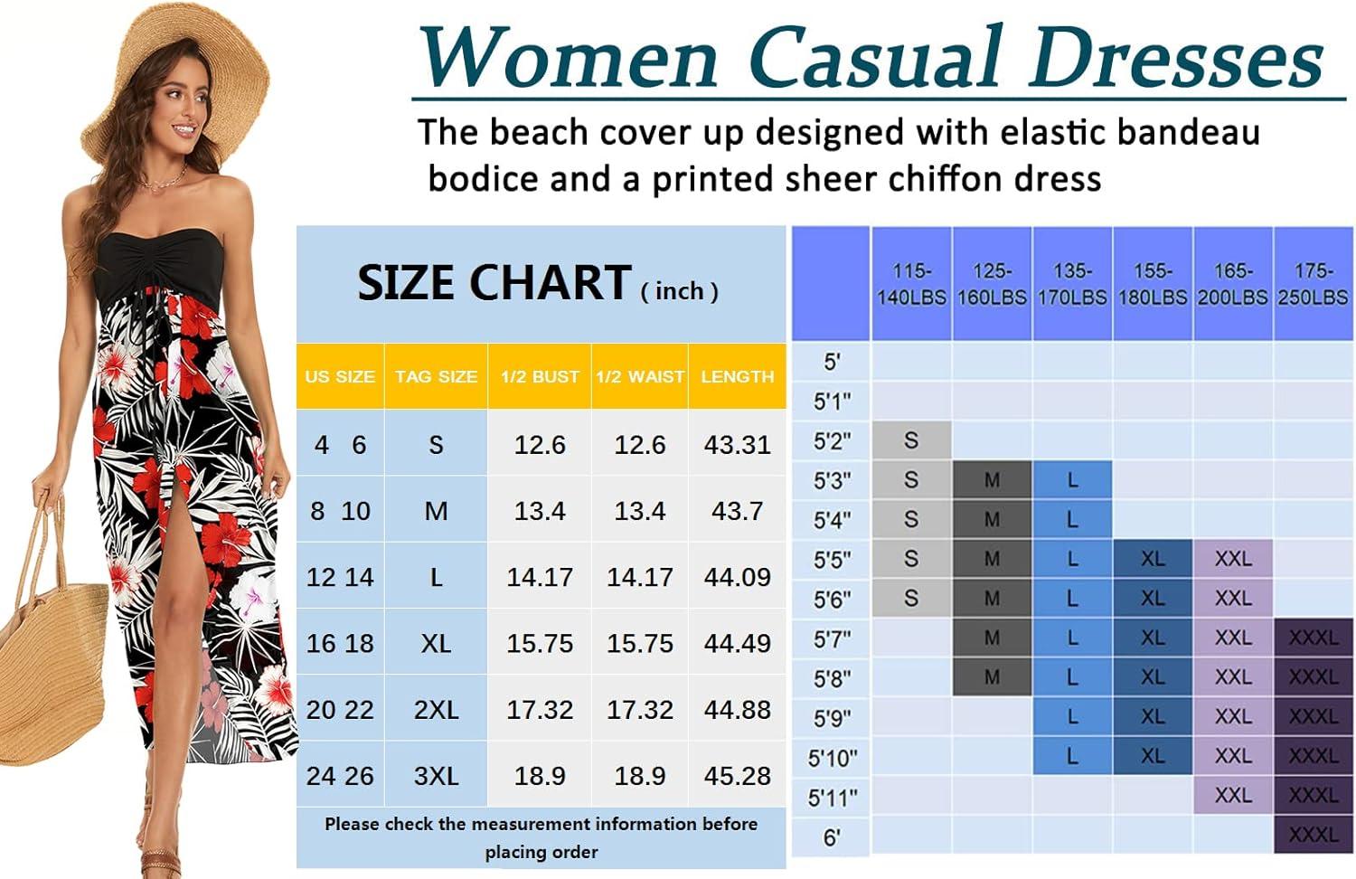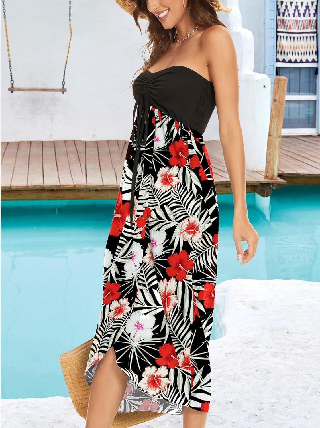 Women's Beach Dress Summer Maxi Sundress Strapless Hawaiian Cover Ups Asymmetrical Wrap Dresses(Red White Flower)