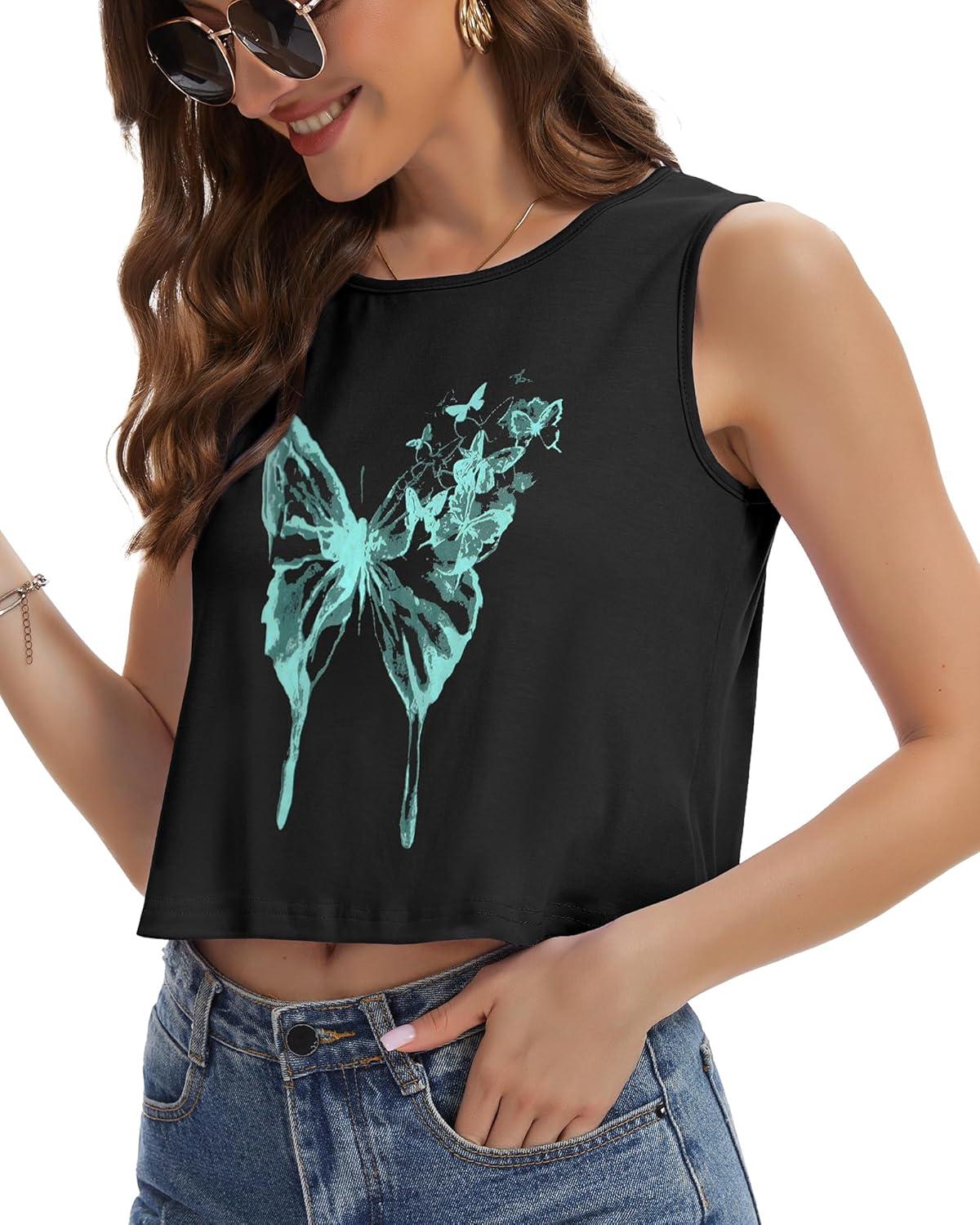 imageWomens Crop Tops Summer Casual Sleeveless Tank Loose Fit Basic ShirtsBlack Green Butterfly