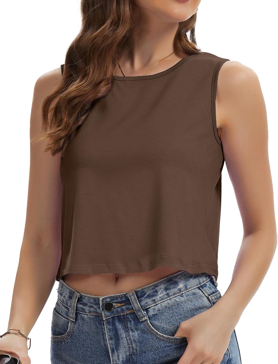 imageWomens Crop Tops Summer Casual Sleeveless Tank Loose Fit Basic ShirtsBrown