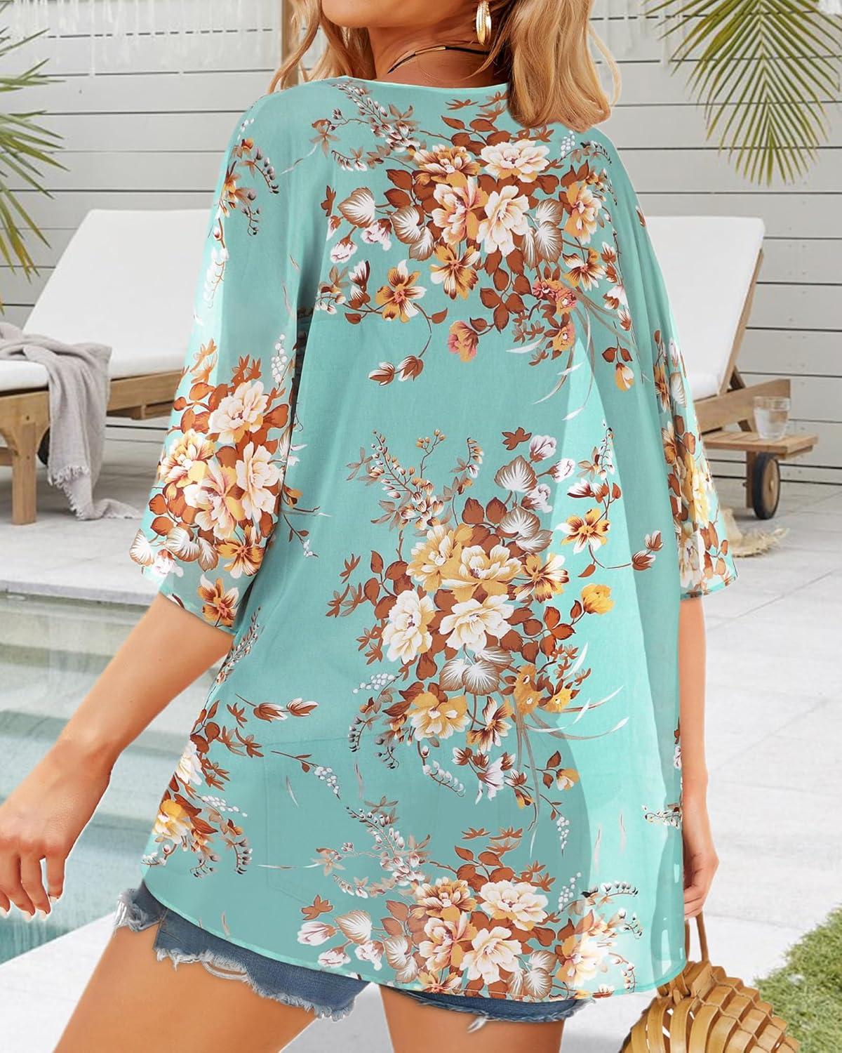 imageWomens Floral Print Puff Sleeve Kimono Cardigan Loose Cover Up Casual Blouse TopsAqua Blue