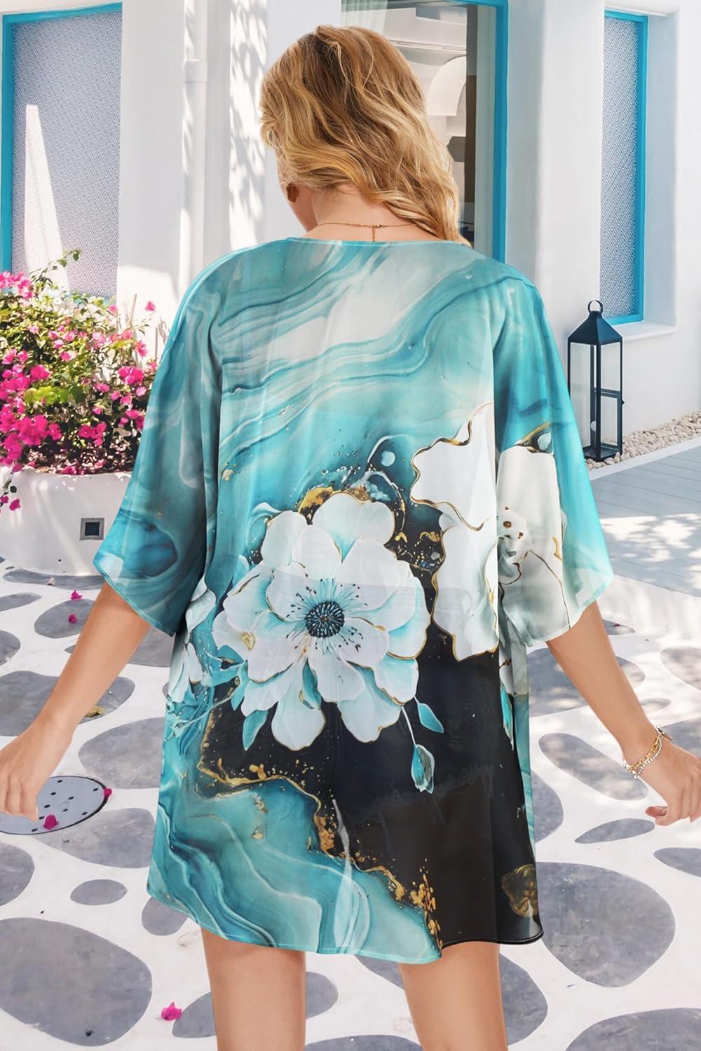 imageWomens Floral Print Puff Sleeve Kimono Cardigan Loose Cover Up Casual Blouse TopsBlue Dark Floral