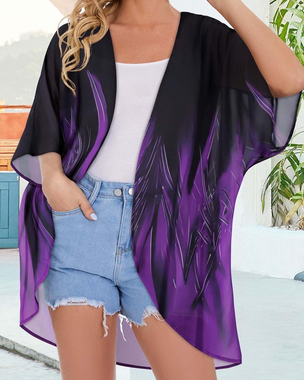 imageWomens Floral Print Puff Sleeve Kimono Cardigan Loose Cover Up Casual Blouse TopsPurple Peach Gradient