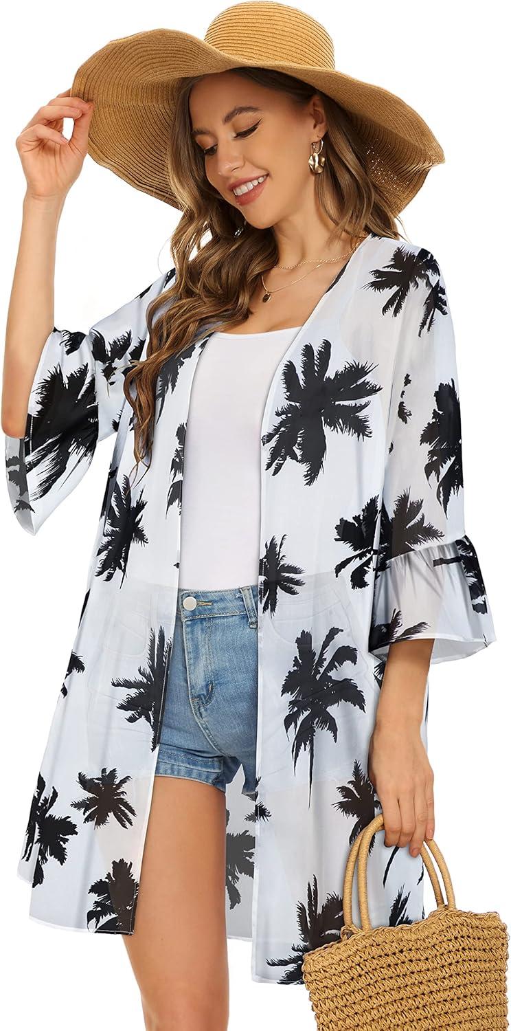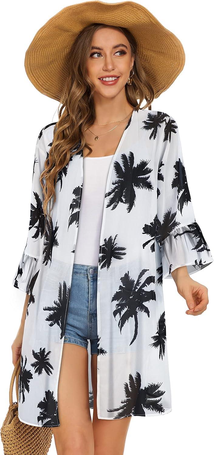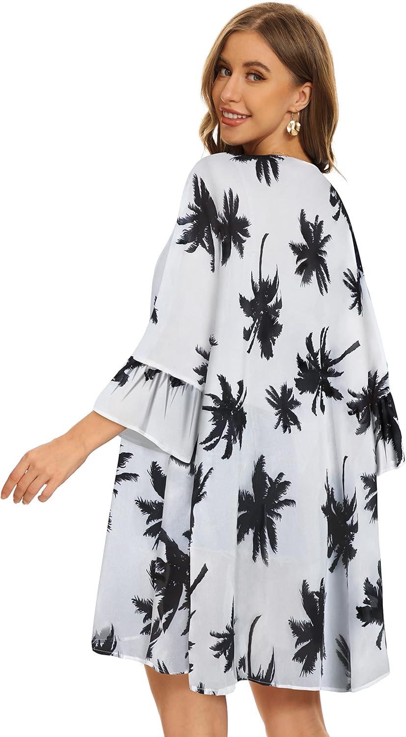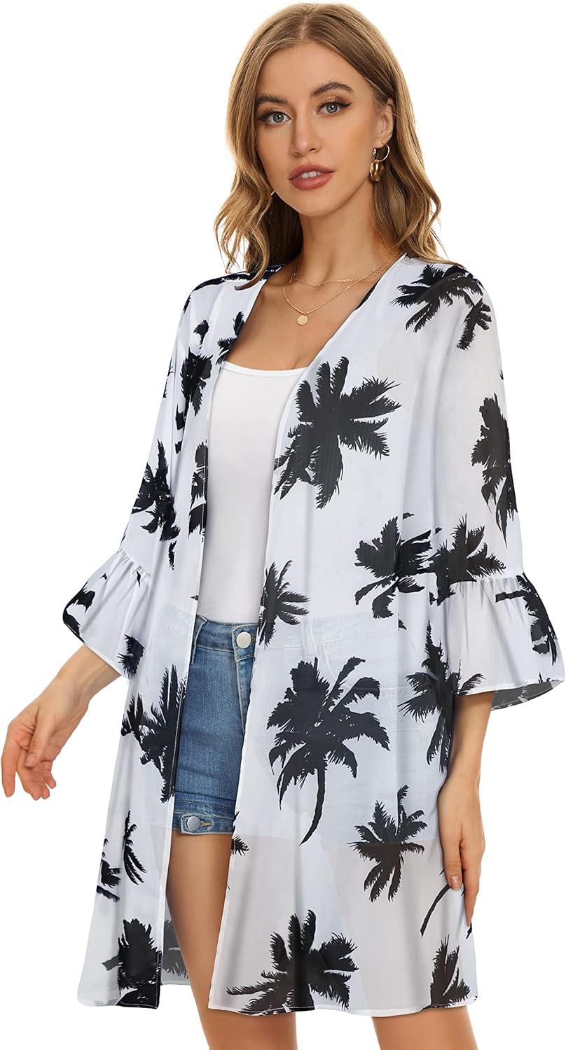 imageWomens Kimono Cardigans Floral Chiffon Loose Open Front Casual Summer TopsWhite Leaf Floral