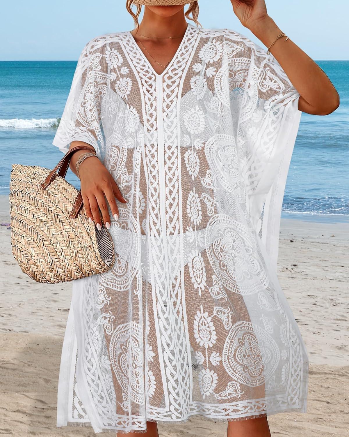 Womens Lace Bathing Suit Cover Up V Neck Beach Coverup Summer Swim Coverups Loose Bikini Beach Dress(White)