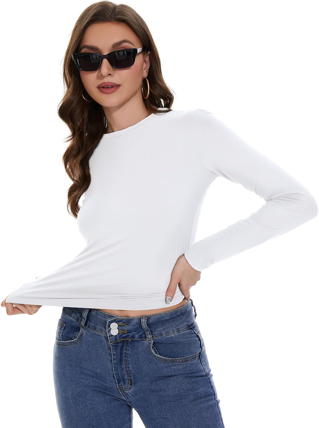Womens Long Sleeve Shirts Basic Tees Y2k Slim Fit T Shirt Crew Neck Trendy Crop Top Casual(01#white)