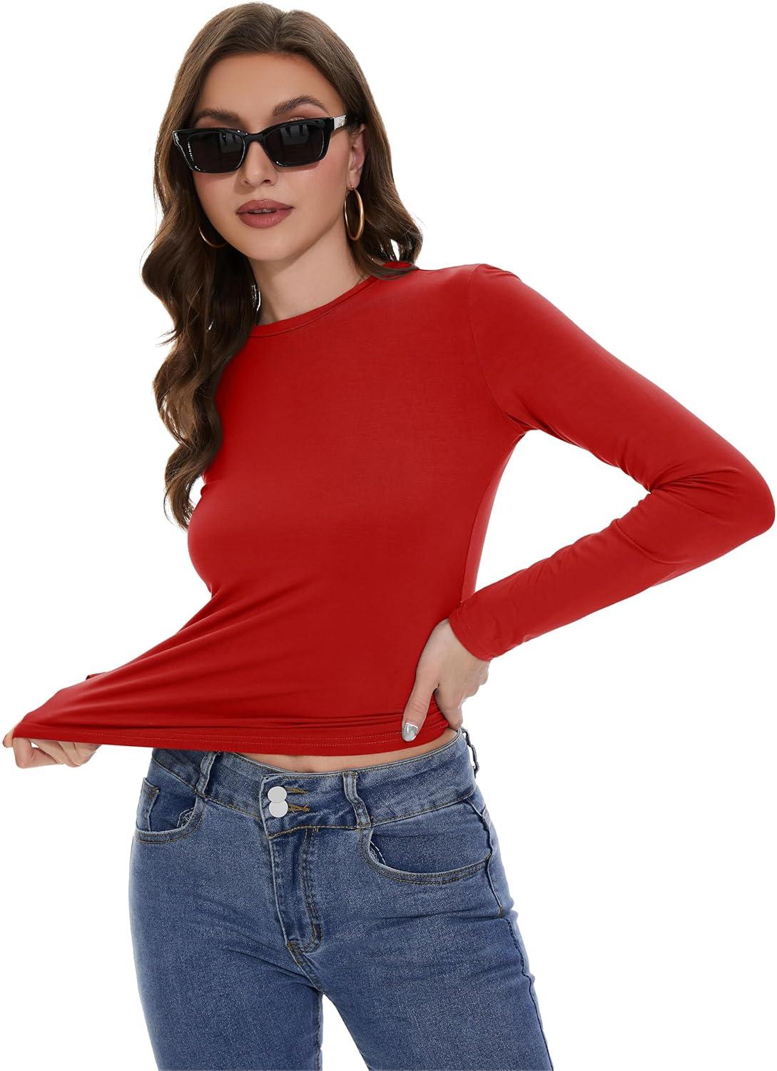 Womens Long Sleeve Shirts Basic Tees Y2k Slim Fit T Shirt Crew Neck Trendy Crop Top Casual(02#red)