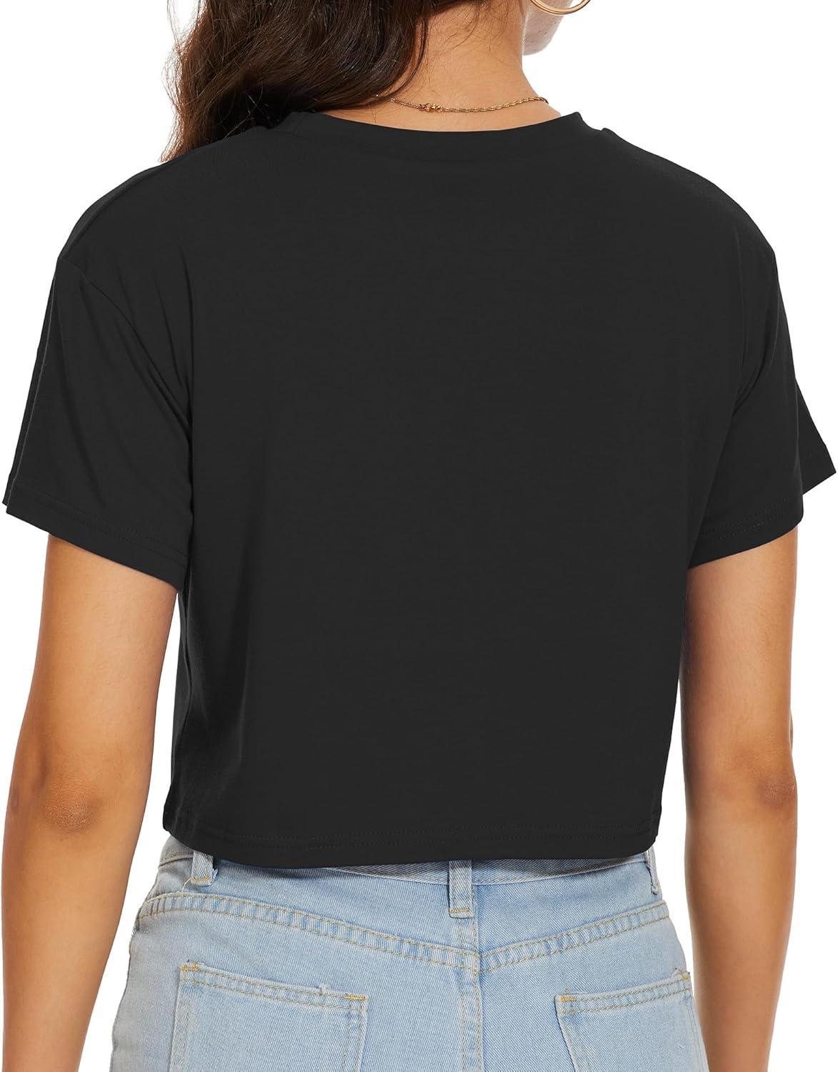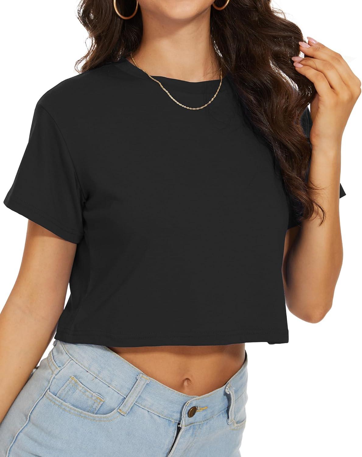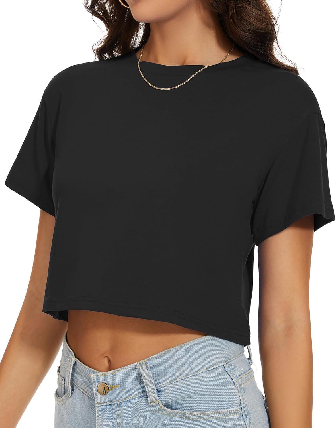 Womens Summer Crop Tops Short Sleeve Round Neck T-Shirts Loose Fit Casual Blouse(A-black)