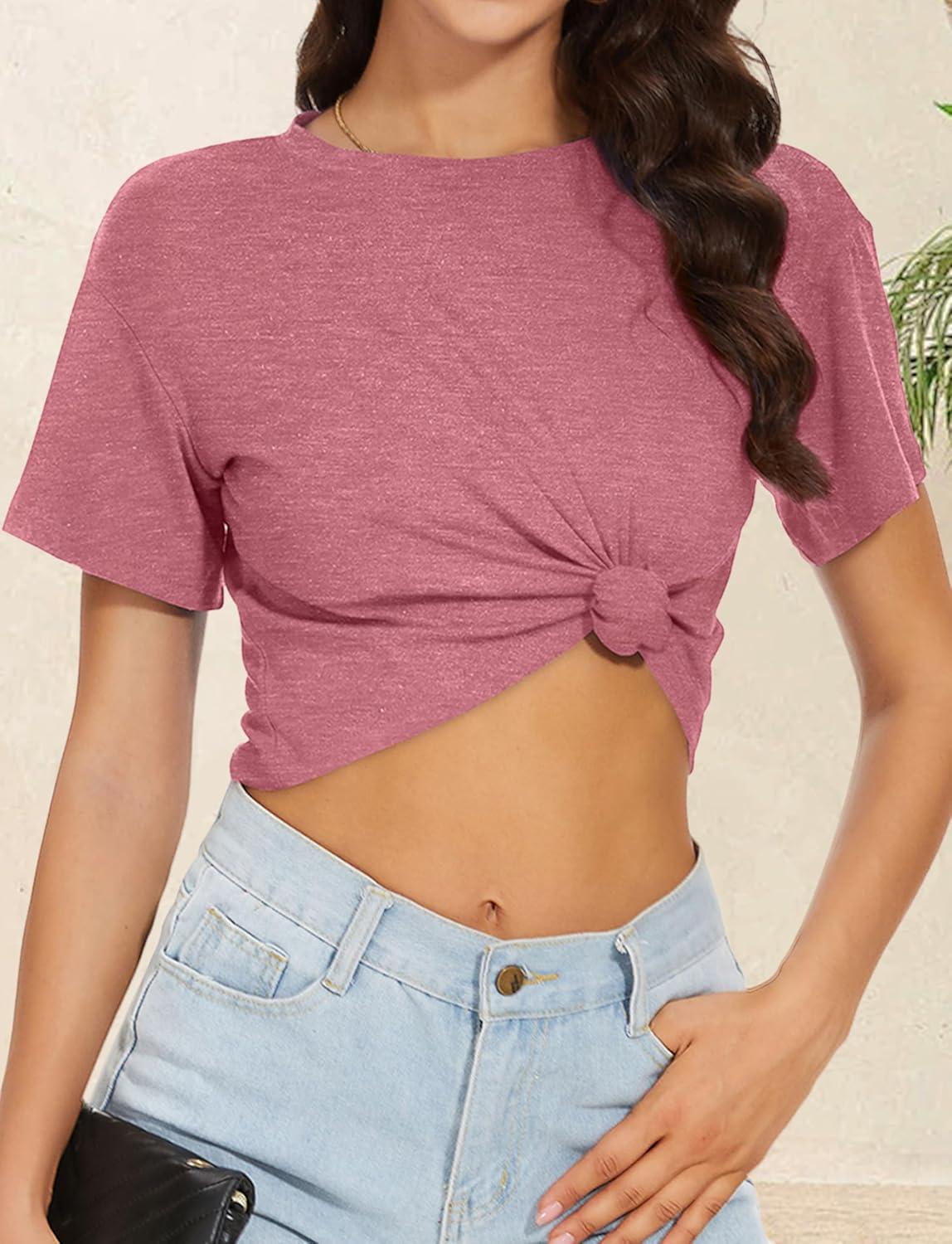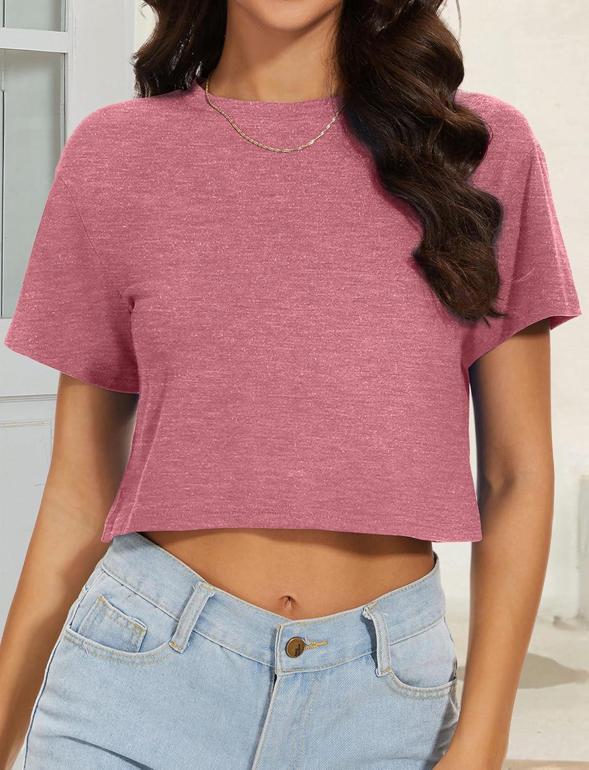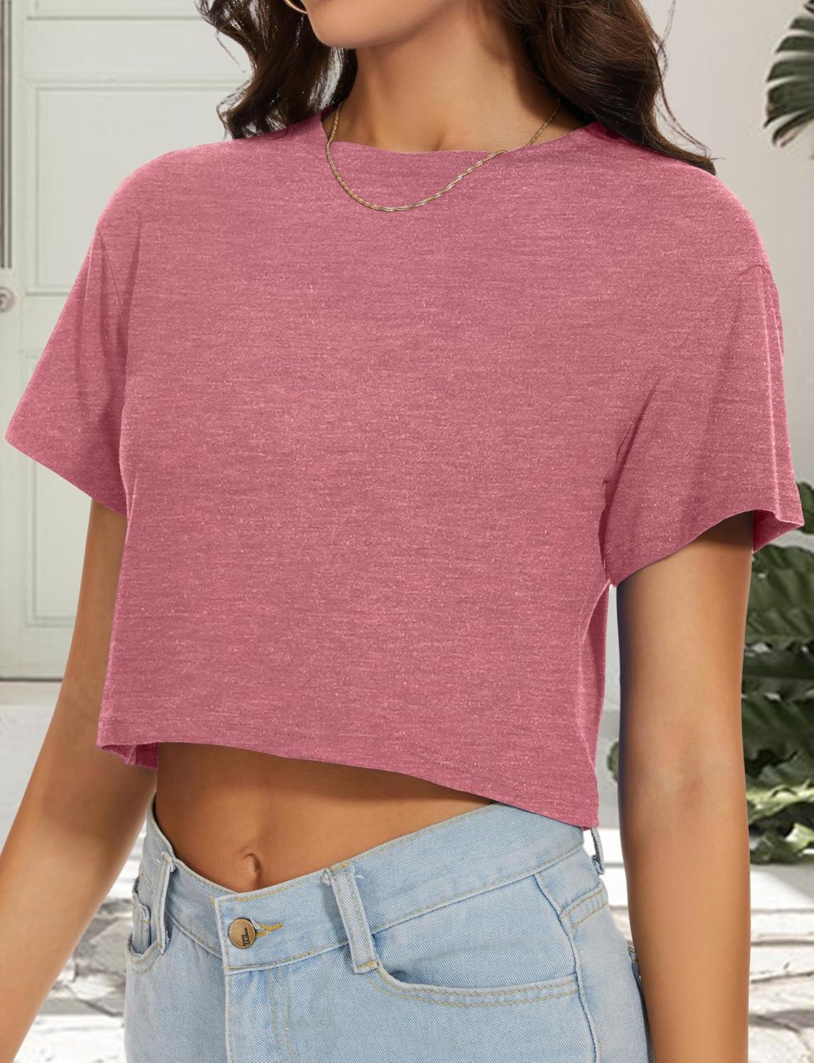 Womens Summer Crop Tops Short Sleeve Round Neck T-Shirts Loose Fit Casual Blouse(B Hot Pink)