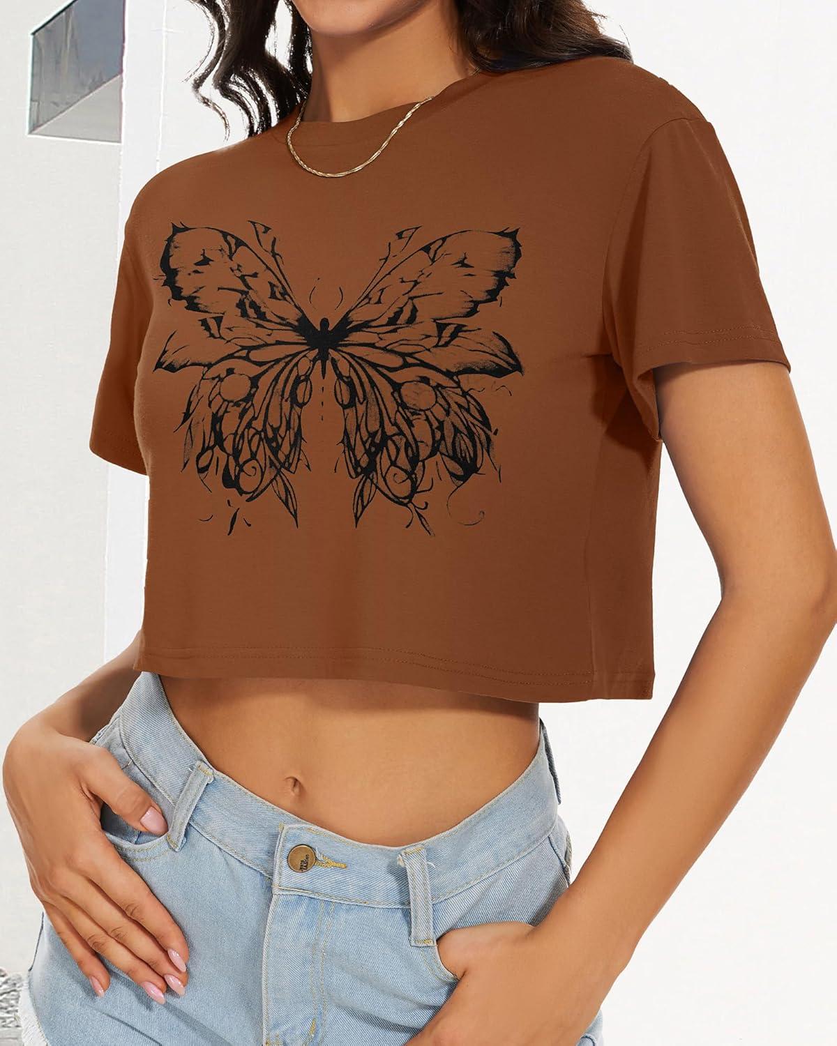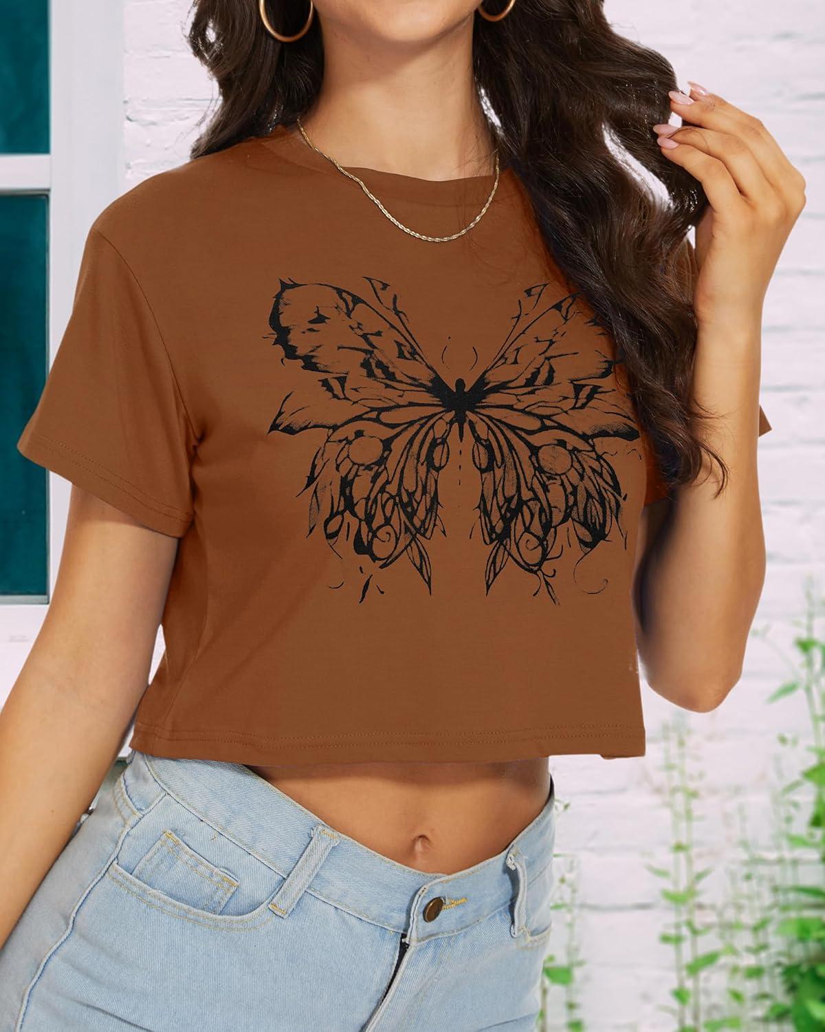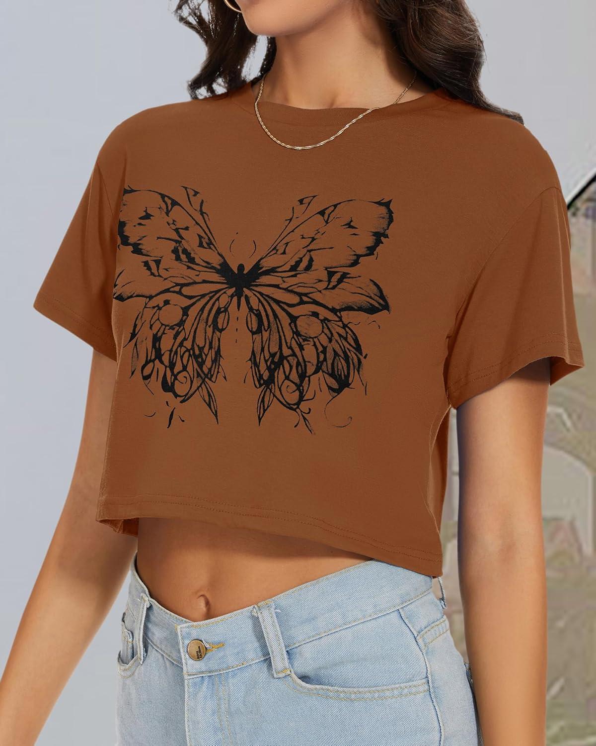 Womens Summer Crop Tops Short Sleeve Round Neck T-Shirts Loose Fit Casual Blouse(C Brown Butterfly)
