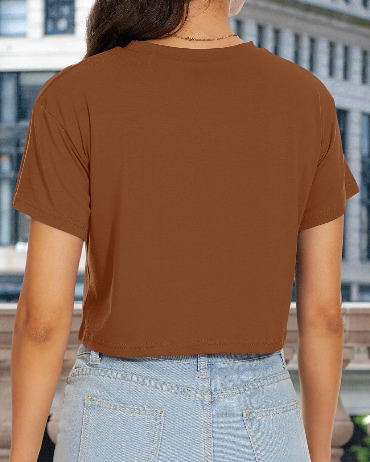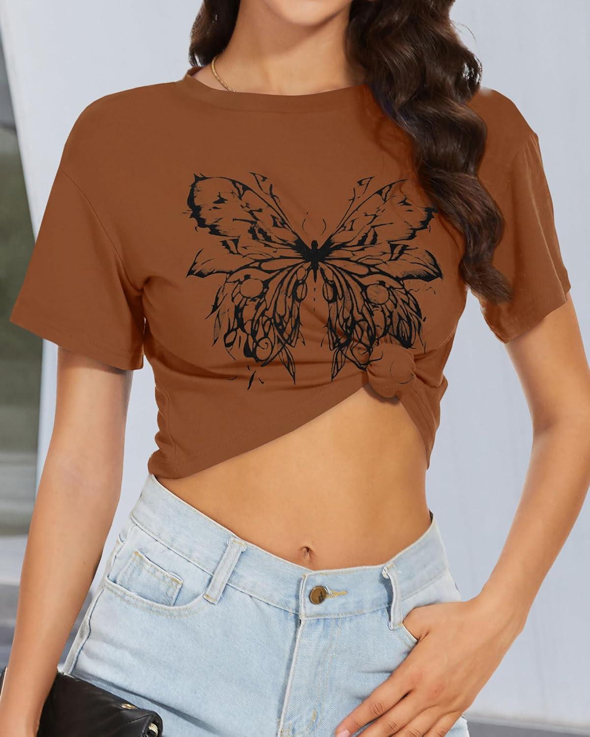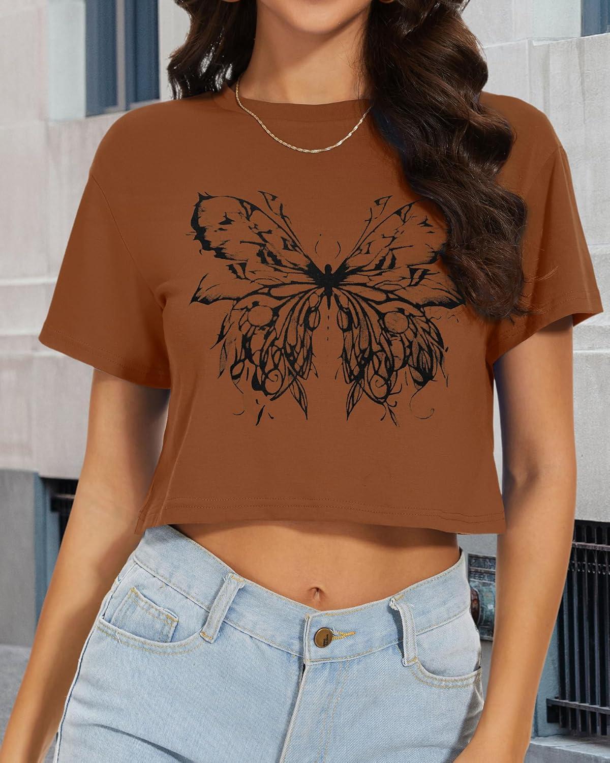 Womens Summer Crop Tops Short Sleeve Round Neck T-Shirts Loose Fit Casual Blouse(C Brown Butterfly)