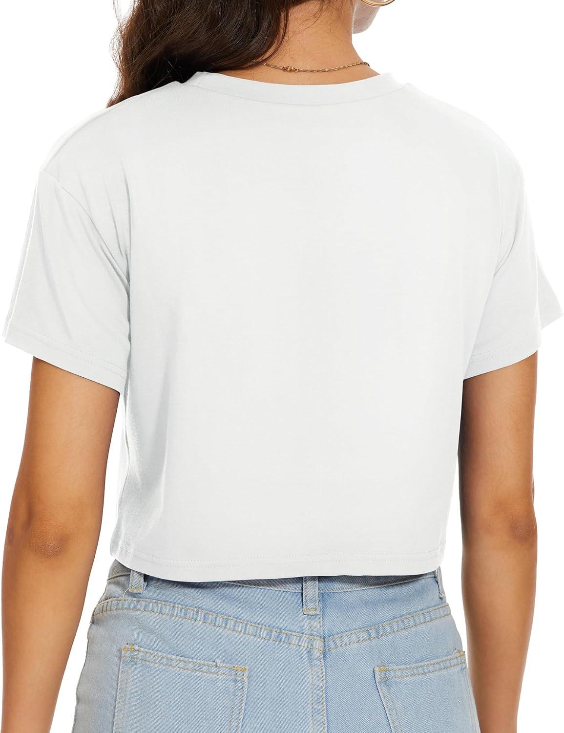 Womens Summer Crop Tops Short Sleeve Round Neck T-Shirts Loose Fit Casual Blouse(E White Butterfly Print)