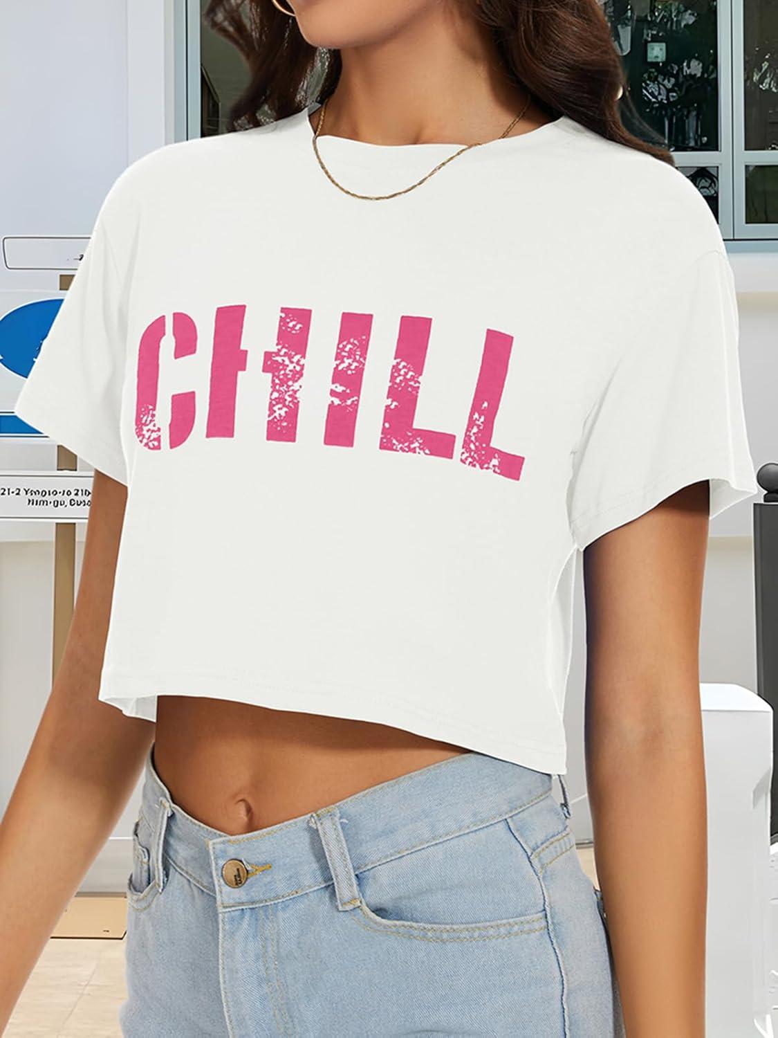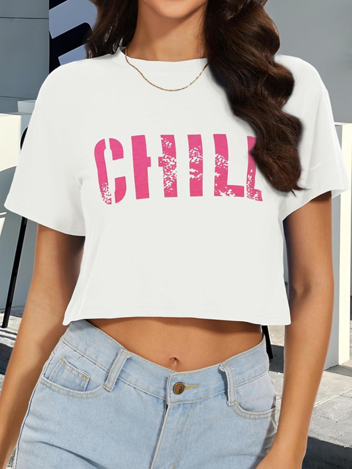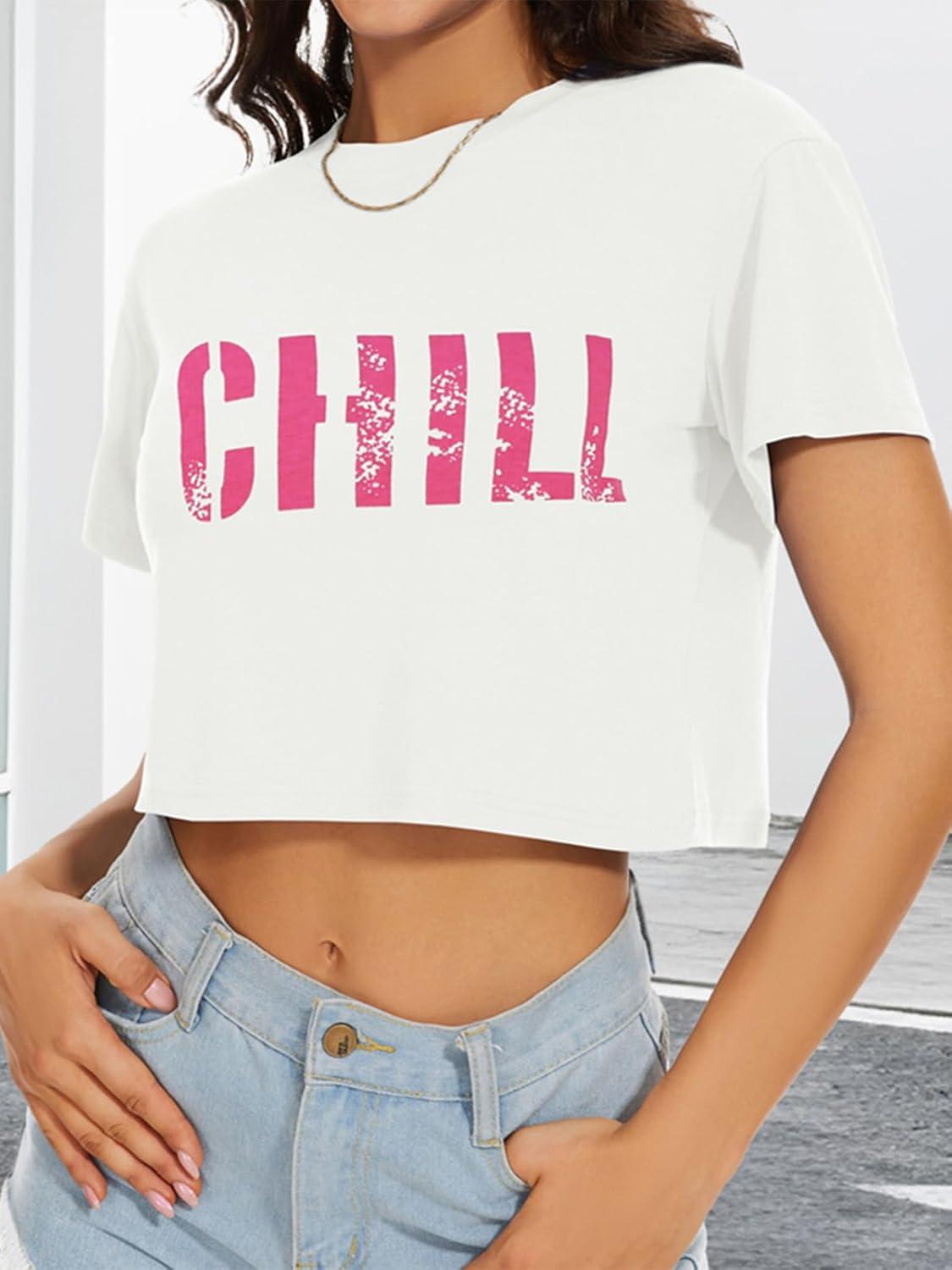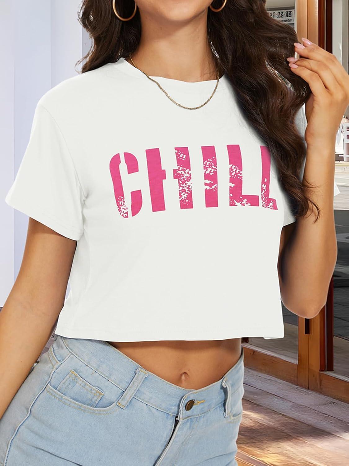 Womens Summer Crop Tops Short Sleeve Round Neck T-Shirts Loose Fit Casual Blouse(E White Pink Letter)