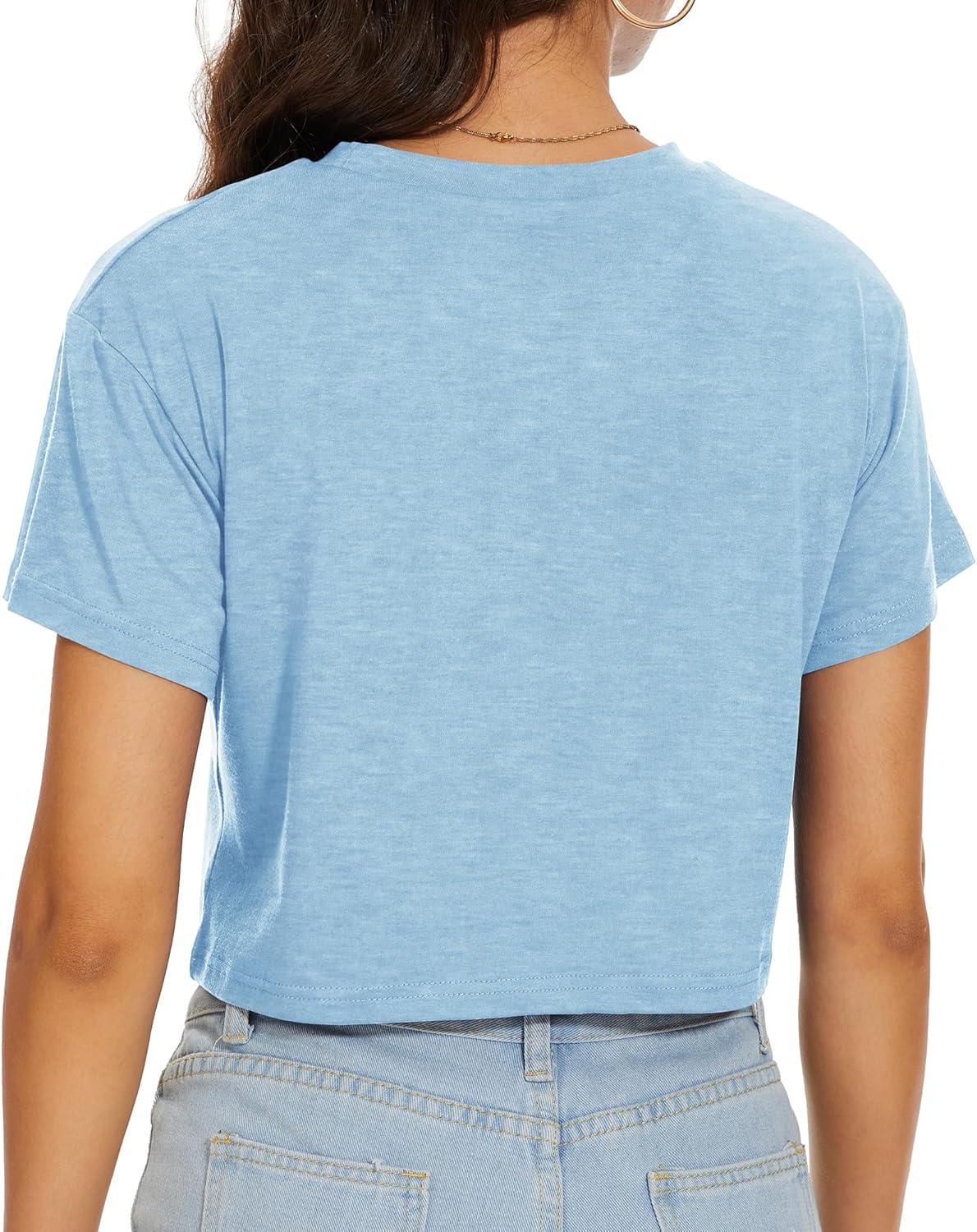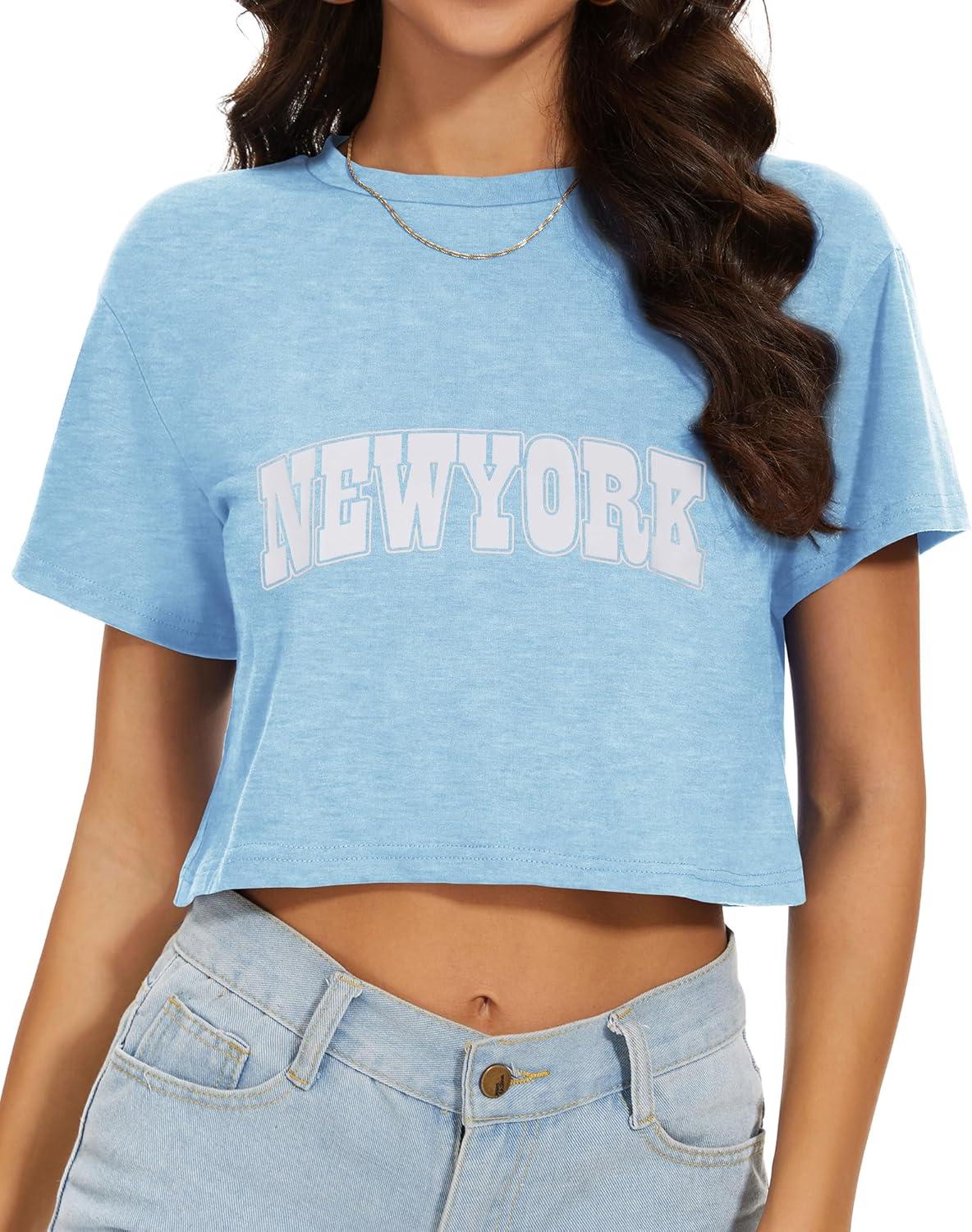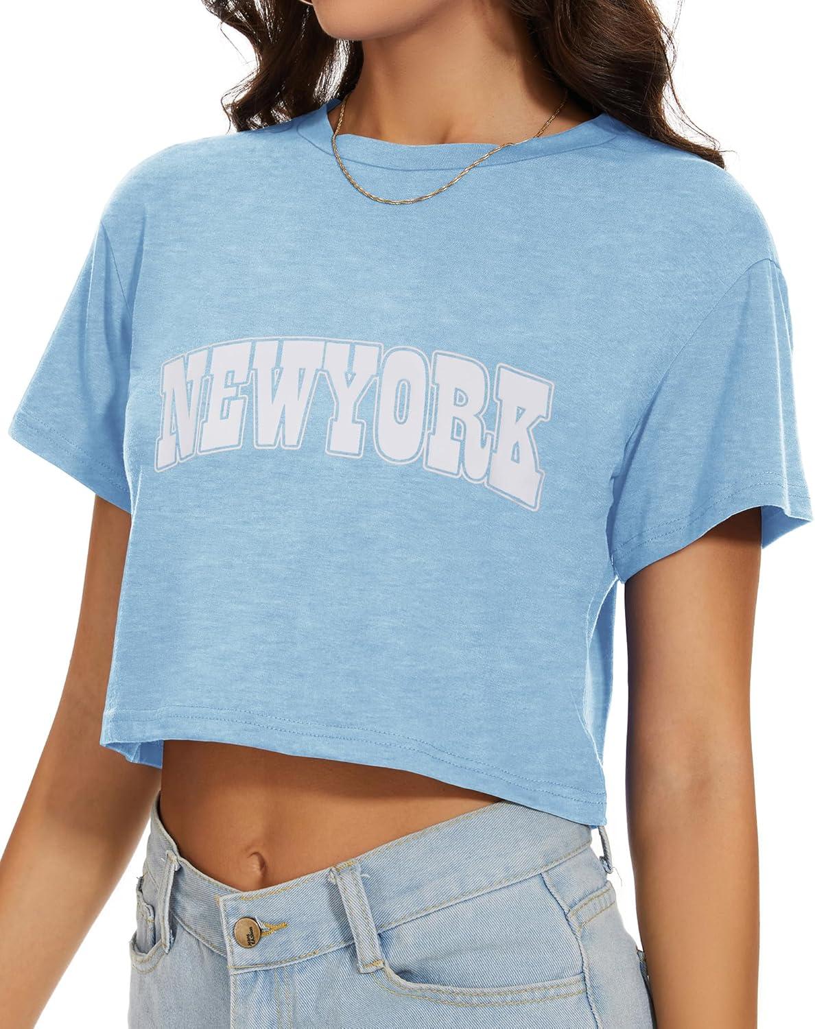 Womens Summer Crop Tops Short Sleeve Round Neck T-Shirts Loose Fit Casual Blouse(F Blue New York)